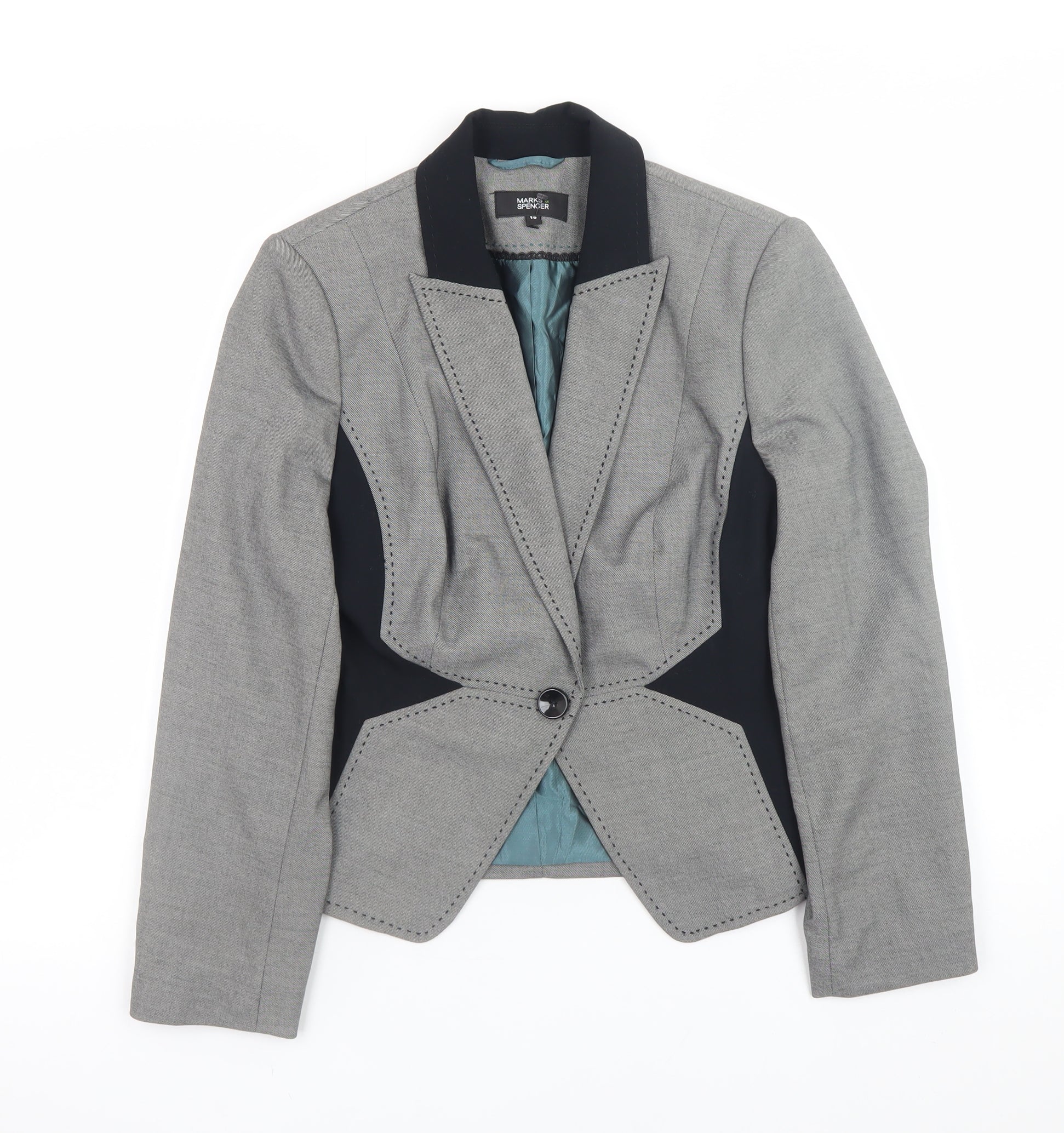 This elegant Marks and Spencer women’s grey slim fit blazer is a timeless wardrobe essential, designed for a polished and confident look. Crafted from a high-quality blend of 83% polyester, 15% viscose, and 2% elastane, it offers both comfort and structure, allowing for ease of movement while maintaining a tailored silhouette. The sophisticated combination of grey tone panels with black detailing and a single-button front closure gives a flattering, modern finish that’s ideal for professional and formal settings. The lined interior, made from acetated and polyamide materials, adds smoothness and ensures that the jacket feels comfortable all day long. With its structured shoulders, long sleeves, and classic lapel neckline, this blazer delivers a streamlined fit that enhances the wearer’s shape. Designed with practicality and everyday wear in mind, it features a single-breasted front and pockets that enhance both look and function. Ideal for business meetings, smart office wear, or stylish social occasions, the blazer seamlessly combines classic tailoring with contemporary detail. Finished with modern contrasting trims and a soft inner lining, it lends sophistication and versatility — perfect over blouses, shirts, or dresses. The grey hue ensures easy pairing with neutral or bold tones, making this piece a flexible addition to any wardrobe. This Marks and Spencer blazer is presented in excellent used condition with light wear and no noticeable damage, reflecting the high durability and quality of the brand. Ideal for the autumn and spring seasons, it provides a polished layer without excess warmth. Whether styled with tailored trousers, skirts, or jeans, this versatile jacket ensures an effortlessly chic finish suited for professional, formal, or semi-casual looks. Perfect for someone seeking timeless fashion that balances comfort, structure, and elegance.