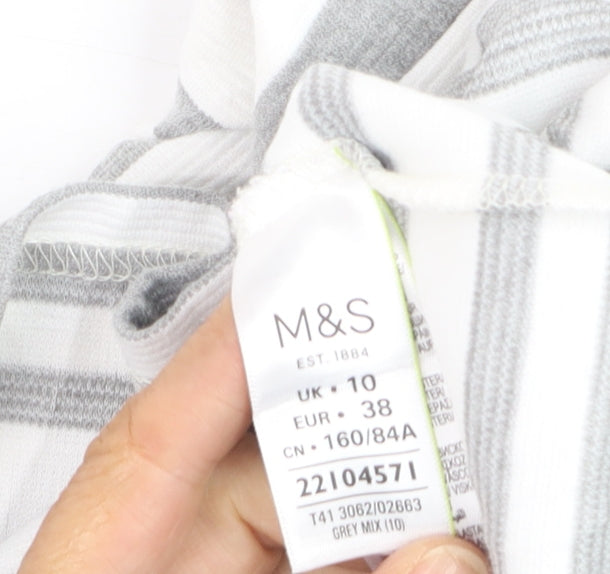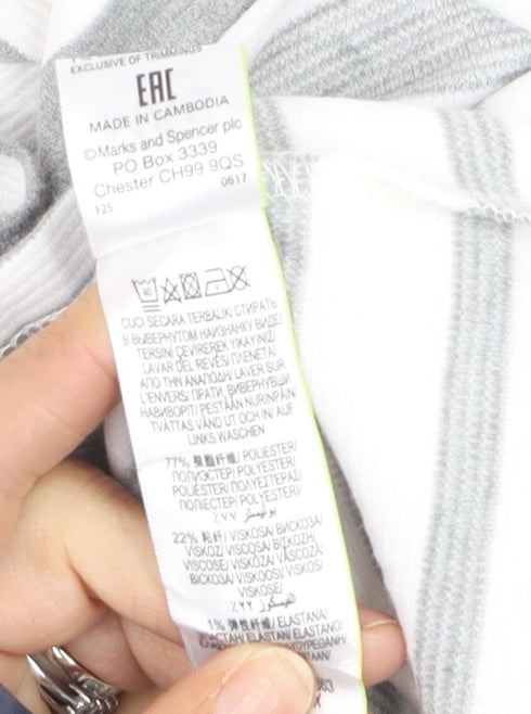 Refresh your wardrobe with this lovely women’s jumper from Marks and Spencer. In a timeless grey and white stripe design, this lightweight pullover is both stylish and easy to wear. Crafted from a soft, breathable blend of polyester, viscose, and elastane, it delivers comfort and stretch for an ideal everyday fit. Designed with a flattering scoop neckline and 3/4 sleeves, this jumper offers the perfect balance between casual and polished. The fine jersey knit fabric gives a smooth, soft handfeel while ensuring durability and ease of movement. This versatile Marks and Spencer piece can be worn across seasons – layer it under a blazer for cool spring mornings, or pair it with jeans or skirts for effortless summer styling. The ‘Classic’ internal label reflects its enduring, wardrobe-staple charm. Suitable for casual outings, smart workwear, or relaxed weekends away, it’s an essential that dresses up or down with ease. In excellent pre-loved condition with minimal signs of gentle wear, this garment retains its original shape and finish. Marks and Spencer are known for their enduring quality and considered design, ensuring this striped pullover will bring both style and comfort to your everyday outfits. Machine washable for convenience and made with added stretch for a flexible fit, it’s a dependable layering piece that never goes out of fashion. Perfect for transitional seasons, its breathable yet cosy construction makes it a must-have addition to any woman’s wardrobe who values simplicity, comfort, and elegance.