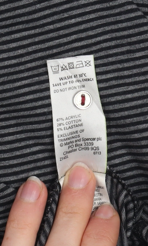 This Marks and Spencer women’s long-sleeve top is a classic and versatile piece that blends comfort with effortless style. Designed in a flattering Henley neckline featuring a neat button placket, it combines casual comfort with a slightly refined touch, making it suitable for multiple occasions. Crafted from a high-quality blend of 67% acrylic, 28% cotton, and 5% elastane, the fabric has a soft jersey finish that feels breathable and comfortable while offering a gentle stretch to ensure a flattering fit throughout wear. The fine grey-and-black stripe pattern gives it a timeless aesthetic that pairs effortlessly with jeans, skirts, or trousers. Perfect for layering under jackets or cardigans, this piece transitions seamlessly between seasons – ideal for the cooler months of autumn and winter, yet lightweight enough for spring outings. The long sleeves and regular fit provide comfort and warmth without feeling heavy, while the stretch fabric moves easily with the body. Easy to care for, this top is machine washable, maintaining its appearance wash after wash. Whether worn for a relaxed day at home, casual workwear, or weekend errands, this top offers understated sophistication that’s true to Marks and Spencer’s renowned quality. Its durable construction and soft material make it a long-lasting addition to any wardrobe. Overall, this grey striped Henley top embodies practical style – a dependable go-to item that ensures comfort and confidence for the modern woman seeking both simplicity and elegance in her everyday wear. Excellent used condition with minimal signs of wear, no marks or flaws visible. Ideal for anyone seeking reliable, easy-care, and effortlessly stylish casualwear.