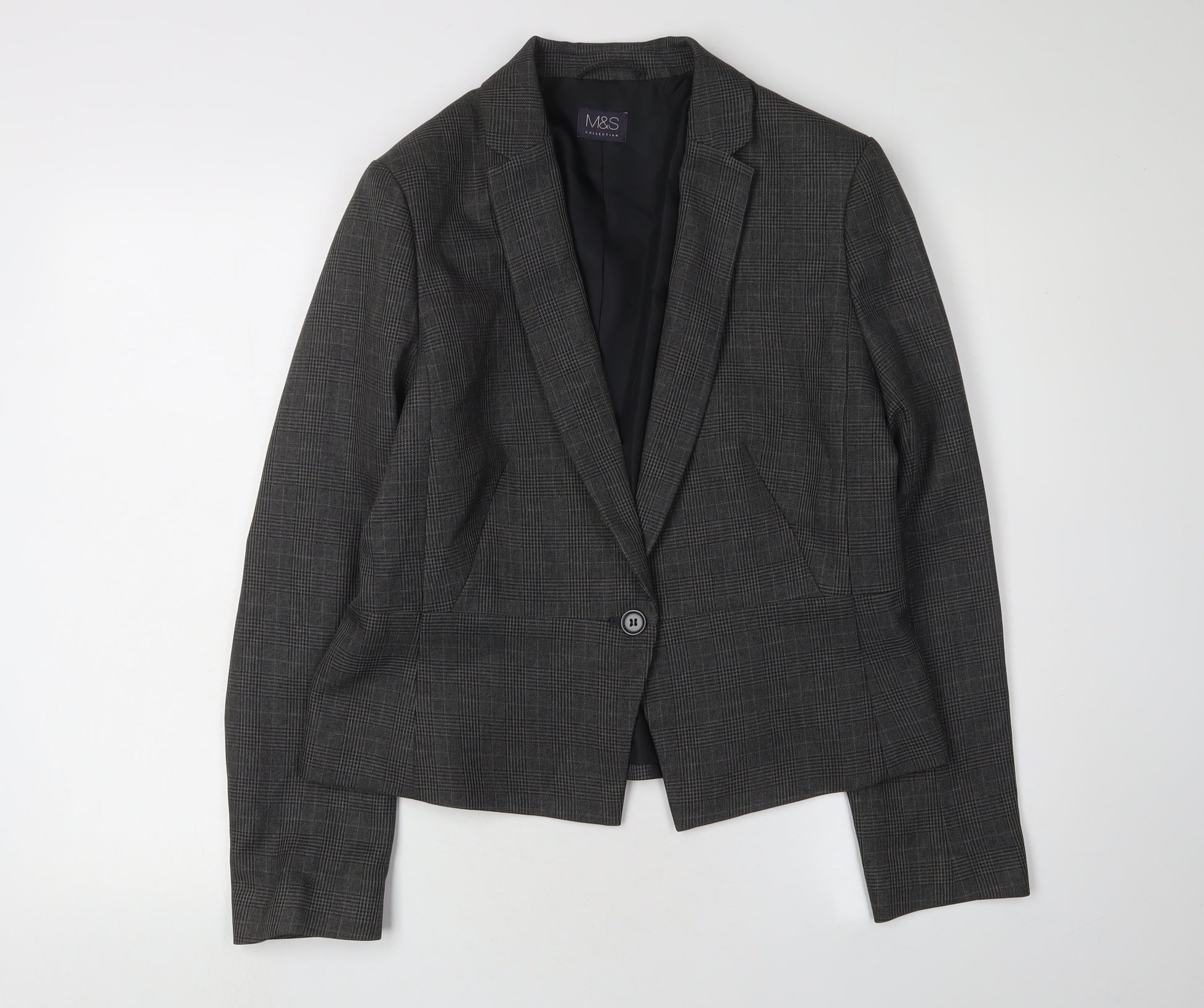 Elevate your wardrobe with this stylish women's blazer from Marks and Spencer. Crafted for both business and casual settings, this jacket comes in a sophisticated grey check pattern, making it an excellent addition to any ensemble. Its composition of 100% polyester ensures not only a comfortable fit but also long-lasting durability. Designed for the contemporary woman, it boasts a timeless notch lapel style and the practical feature of being machine washable, helping you maintain its pristine condition with minimal effort. The one-button design adds a touch of elegance, making it versatile enough for both workplace and casual outings. Available in size 14, this blazer offers a regular fit with long sleeves, allowing for ease and comfort throughout the day. Crafted for an exceptional fit, this grey blazer is perfect for women who appreciate quality and style. Whether you're dressing up for work or adding a layer to a weekend look, this jacket is a must-have piece. Purchase this short-length blazer today and experience the refined craftsmanship and timeless design that Marks and Spencer is known for.