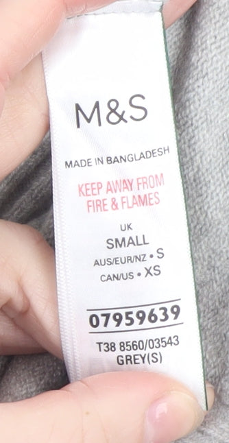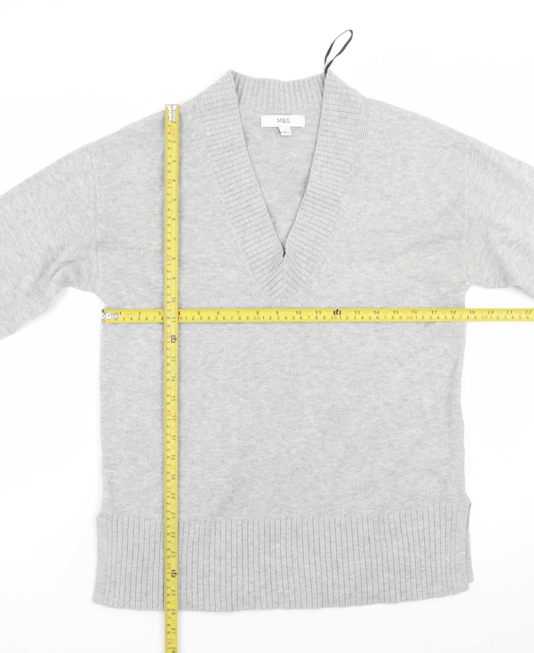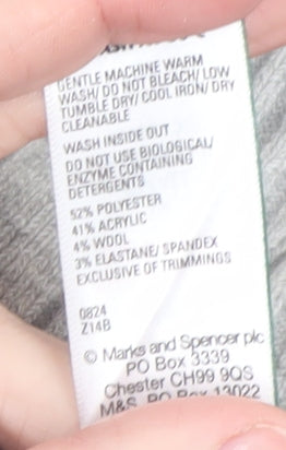 Stay effortlessly stylish and comfortable with this classic Marks and Spencer women's grey V-neck jumper. Expertly crafted from a soft and durable blend of polyester, acrylic, wool, and elastane, this knitwear piece offers both lasting comfort and a refined finish. The jumper features a ribbed V-neckline, cuffs, and hem for a snug fit that maintains its shape while offering a flattering silhouette. In a versatile neutral grey shade, it pairs seamlessly with skirts, trousers, or jeans, making it a wardrobe essential for work, casual outings, or layering through the cooler months. The lightweight yet cosy knit design ensures warmth without bulk, perfect for autumn, winter, or spring. Designed with long sleeves and a regular fit, this pullover jumper complements a wide range of body shapes and provides easy wear for all-day comfort. Machine washable for practical care, it retains its softness and structure wash after wash. With its timeless appeal, quality craftsmanship, and understated elegance, this Marks and Spencer V-neck jumper is a go-to option for effortless, everyday chic. Ideal for women who appreciate both comfort and sophistication, it’s a must-have addition to your knitwear collection. Whether worn alone or layered over a blouse, this soft grey jumper will keep you cosy and stylish in any setting.