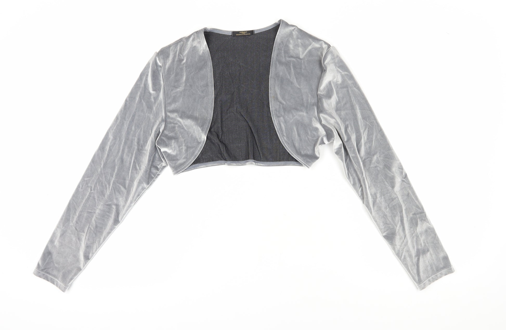 This elegant Marks and Spencer bolero jacket is the perfect addition to your wardrobe, providing a touch of sophistication to any ensemble. Crafted from a luxurious blend of polyester and polyamide, it features a soft velvet fabric that exudes class and comfort. Ideal for autumn and spring evenings, this cropped jacket has a flattering open front that makes it perfect for layering over party and cocktail outfits. Designed with long sleeves, it offers a vintage flair that complements both modern and classic styles. The jacket comes in a light grey shade, offering versatility to pair with a variety of colours. Its machine washable nature ensures easy care without compromising on style. Though not new with tags, the condition is very good with only minor wear and a small stain that doesn't detract from the overall appeal. Add this piece to your wardrobe and enjoy its timeless charm on many occasions.