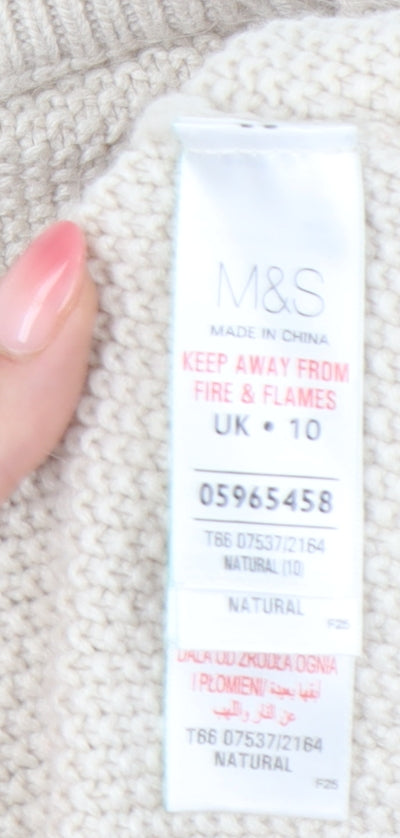 Elevate your wardrobe with this elegant Marks and Spencer Women's Ivory Cable-Knit Pullover. Designed with a classic crew neck and long sleeves, this jumper is perfect for all seasons, providing both comfort and style for any casual occasion. Crafted from a luxurious blend of polyamide, viscose, and angora, the soft knit fabric offers warmth and a gentle touch against the skin. The intricate cable-knit pattern adds a touch of sophistication, making this piece a versatile staple. Ideal for cooler months, its regular fit ensures a flattering silhouette, while the neutral ivory colour complements a variety of outfits. Pair with your favourite jeans or a chic skirt for a timeless look. Machine washable for easy care, this jumper is a must-have. Condition: Brand new with original tags, with no signs of wear or damage. Don't miss the chance to add this high-quality piece to your collection.