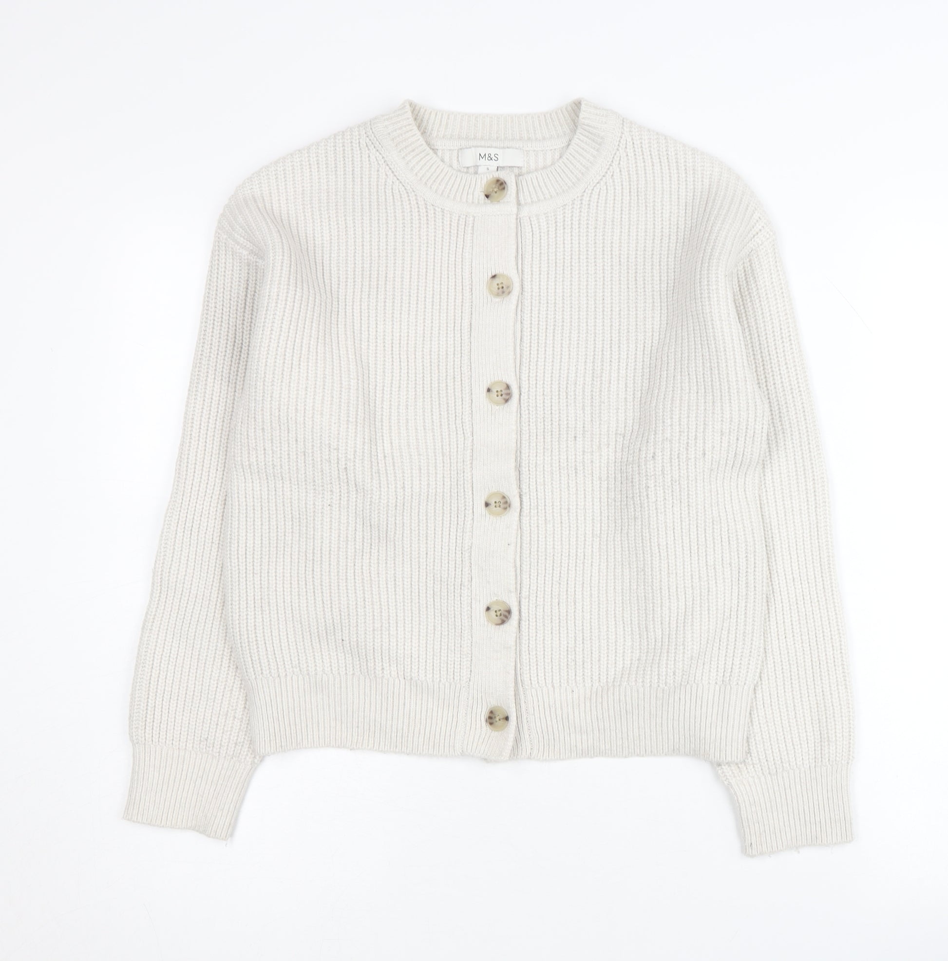 This elegant Marks and Spencer cardigan in a warm ivory tone is a must-have for your wardrobe. Crafted from a comfortable wool blend, it features a classic crew neck and a button-up front, perfect for casual occasions. Designed with long sleeves and a chunky-knit style, it's ideal for the autumn and winter seasons. The simple yet sophisticated design offers a regular fit that pairs well with various outfits. Enjoy the versatility and timeless appeal of this stylish piece, suitable for all seasons.