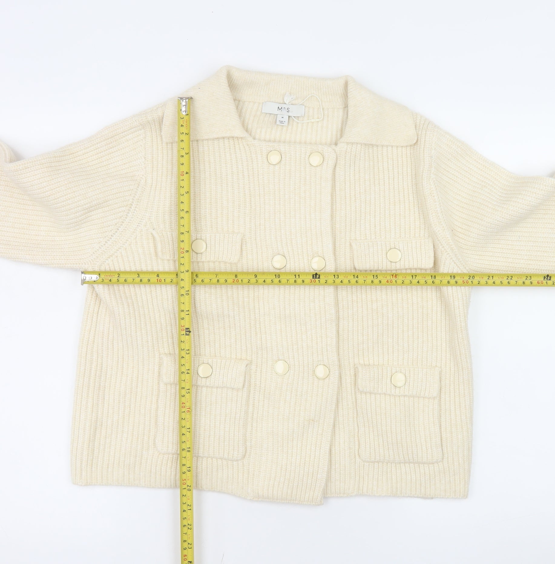 Add timeless charm to your wardrobe with this lovely Marks and Spencer women’s ivory cardigan, crafted in a soft ribbed knit for both warmth and comfort. Designed in an effortlessly classic style, this collared cardigan features smart button details down the front, lending a touch of elegance to your casual or semi-formal looks. The rich ivory shade provides a versatile base that pairs beautifully with trousers, jeans, or skirts, making it a go-to piece for layering across autumn and winter seasons.The main body of the cardigan is made from a quality fabric blend of polyester, acrylic, and polyamide, providing a warm yet breathable texture with a comfortable medium weight. Its subtle ribbed knit design adds tactile sophistication while offering a stretchy fit that flatters the figure without clinging too tightly. The long sleeves and structured collar emphasize a polished, put-together appearance, ideal for chilly days at work or relaxing evenings out.Crafted to Marks and Spencer’s high standards, this piece is machine washable, allowing for easy care and lasting wearability. The cardigan is in excellent pre-loved condition with no noticeable flaws, maintaining its original shape and softness. Stylishly understated with front patch pockets and button detailing, it merges comfort with fashion-forward sensibility.Perfect for layering over blouses, turtlenecks, or casual tees, this versatile knitwear piece embodies effortless sophistication. Whether styled with tailored trousers for a business-casual look or paired with denim for relaxed weekend wear, this cardigan offers endless outfit possibilities. With its neutral ivory tone and premium knit finish, it’s a wardrobe staple that delivers warmth, comfort, and enduring style throughout the cooler months. Ideal for women who appreciate classic design and quality craftsmanship from a trusted British brand.