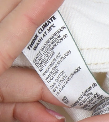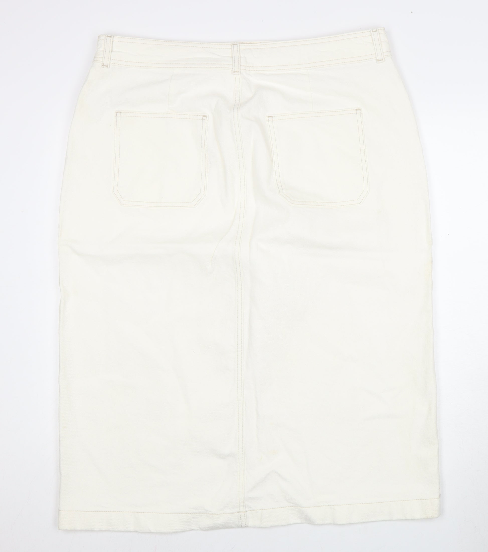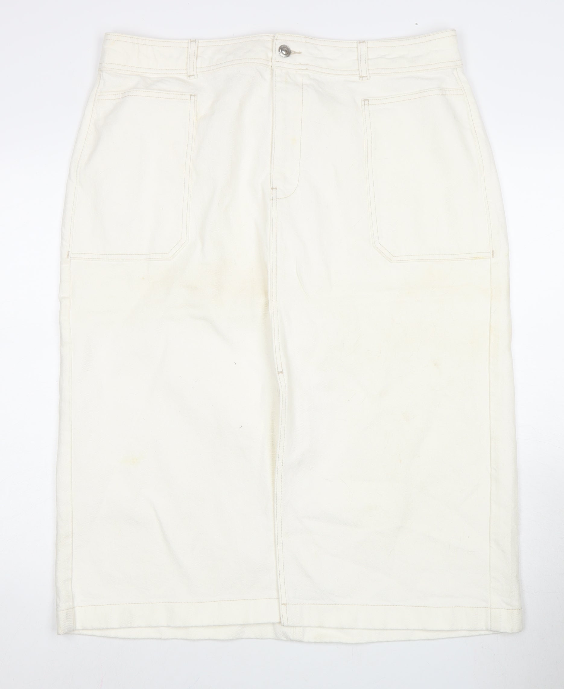 Elevate your wardrobe with this chic Marks and Spencer Women's Ivory Midi Pencil Skirt, perfect for adding a touch of elegance to any casual ensemble. Crafted from a blend of cotton and elastane, this skirt offers a comfortable yet stylish fit. The midi length and timeless straight & pencil style ensure it remains a versatile choice, suitable for various occasions, from brunch to casual Fridays at work. In addition, the classy ivory colour adds a sophisticated flair, making it easy to pair with your favourite tops and accessories. Designed with practicality in mind, this skirt features handy pockets for a convenient touch. The skirt is finished with a button and zip closure for a secure fit. Available in a size 20, it falls within the regular size range and is machine washable, ensuring easy care. Despite some light wear visible, this skirt is in very good condition and ready to become a staple piece in your collection. Make this elegant skirt yours today and enjoy its effortless blend of comfort and style. Whether you're dressing up for a day out or keeping it casual, this Marks and Spencer piece is sure to impress.
