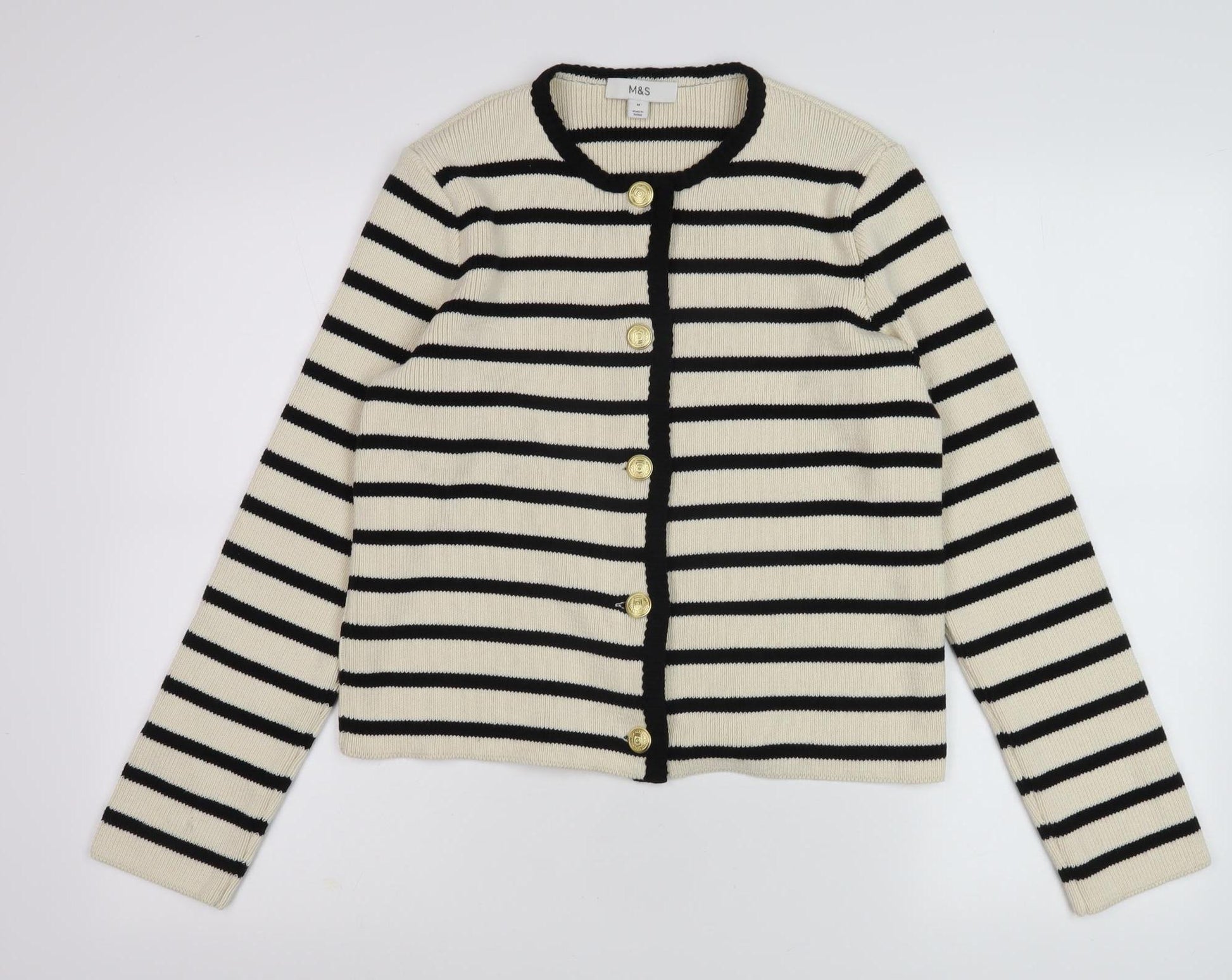 Elevate your wardrobe with this elegant Marks and Spencer Women's Cardigan, featuring an eye-catching striped design in classic ivory. Ideal for a touch of effortless style, this cardigan boasts a comfortable crew neck and long sleeves, making it perfect for layering during the cooler autumn and spring months. Made from a quality blend of 51% cotton, 44% polyester, and 5% viscose, it ensures durability and a soft feel when worn. The structured button accents provide a chic finish, while the knit fabric contributes to its timeless appeal. Designed for a regular fit, this versatile piece can be dressed up for a casual office day or add a stylish flair to a weekend outfit. With easy-care properties, it’s machine washable, combining convenience with charm. Whether you're pairing it with jeans for a laid-back look or adding to a dress for added warmth, this cardigan is an essential piece for the fashionable woman. Made in women's size M, it fits the bill for those seeking both comfort and style in their daily wear.