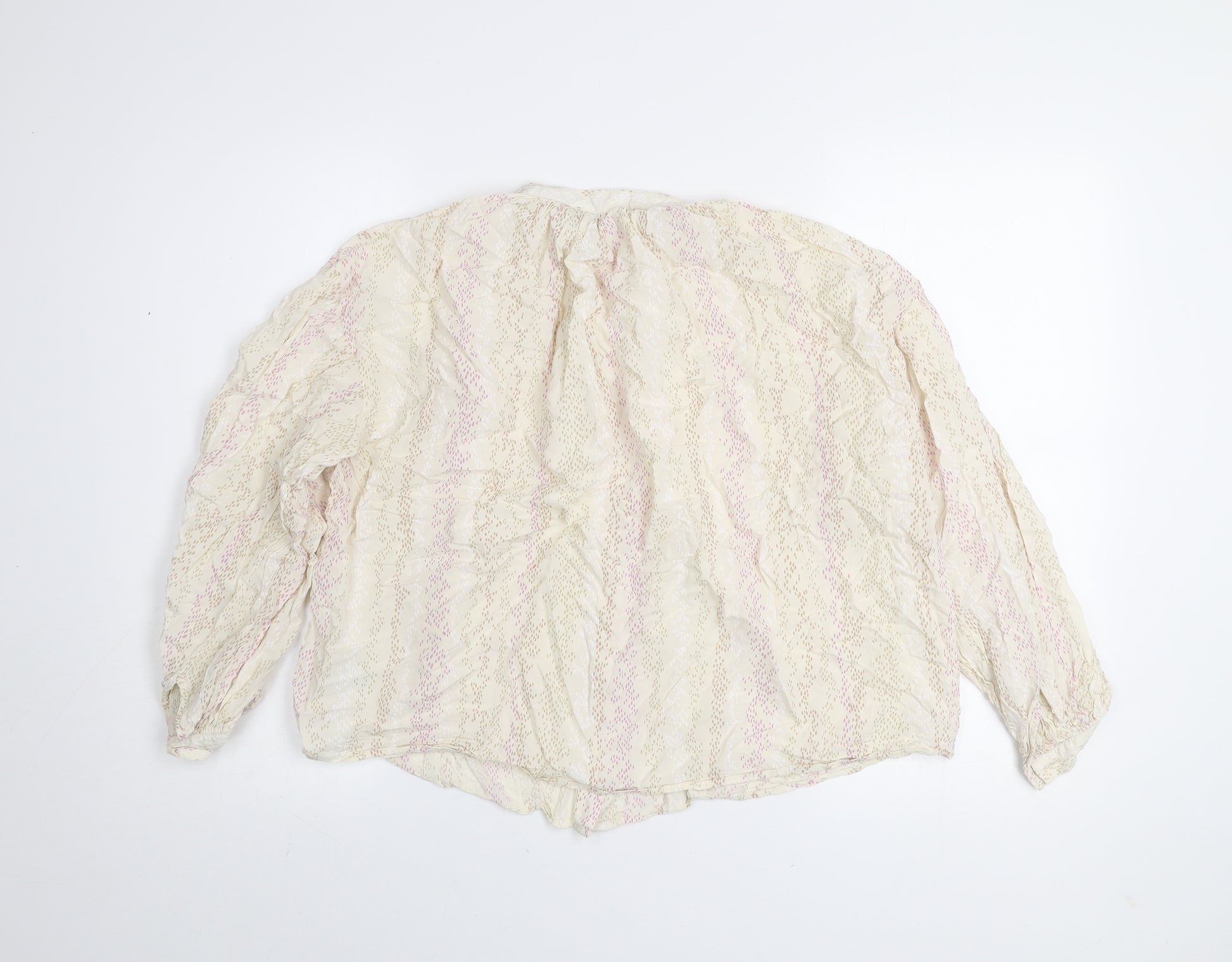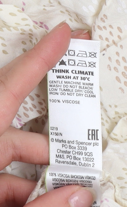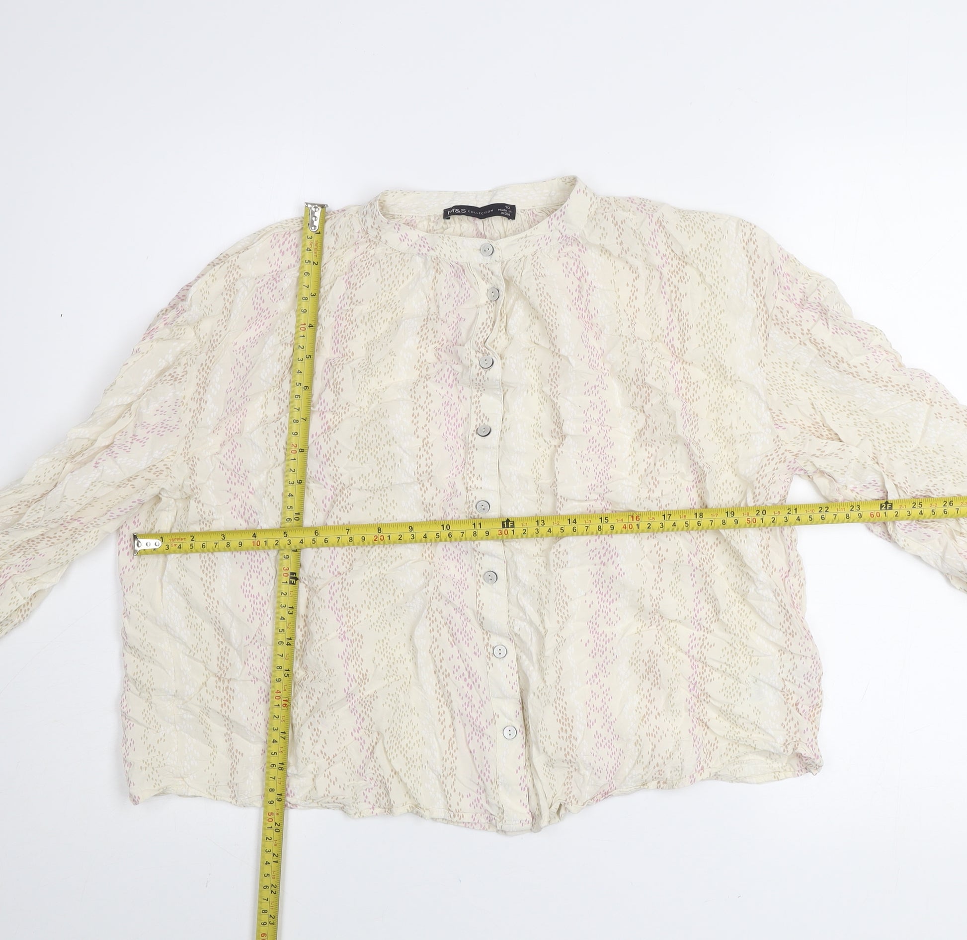 Elevate your everyday style with this beautiful Marks and Spencer women’s tunic blouse in soft ivory. Crafted from 100% viscose, the blouse offers a lightweight, breathable feel with gentle draping that flatters the form. Designed in a relaxed fit, it features a full button front fastening, giving it a timeless silhouette suitable for layering or wearing alone. The long sleeves add subtle volume at the cuffs, maintaining a soft, feminine shape. The delicate woven geometric-inspired pattern in neutral and soft pink tones adds understated interest without overwhelming your look.This blouse combines effortless comfort with refined detailing — perfect for versatile wear across seasons. The breathable viscose fabric ensures comfort during spring and summer, while its easy-care, machine-washable nature makes it ideal for regular rotation. Its subtle texture and natural drape bring stylish movement to both casual and smart-casual outfits. Pair it with jeans for a relaxed weekend ensemble or tuck it into tailored trousers for a simple workwear outfit.The design reflects Marks and Spencer’s timeless quality, offering both elegance and practicality in one piece. With a crew neckline and classic button closure, it creates a flattering, easy-to-style silhouette suitable for a variety of body shapes. The blouse’s relaxed, tunic-inspired cut and light textured pattern make it an accessible choice for women who appreciate understated sophistication.In excellent pre-loved condition, this blouse shows minimal signs of wear and remains in beautiful shape, ready to refresh your wardrobe with its chic simplicity. Perfect for casual outings, brunch dates, or light office wear, this piece makes a subtle yet stylish statement. For those who value both comfort and timeless design, this Marks and Spencer blouse delivers an appealing blend of texture, elegance, and everyday versatility.