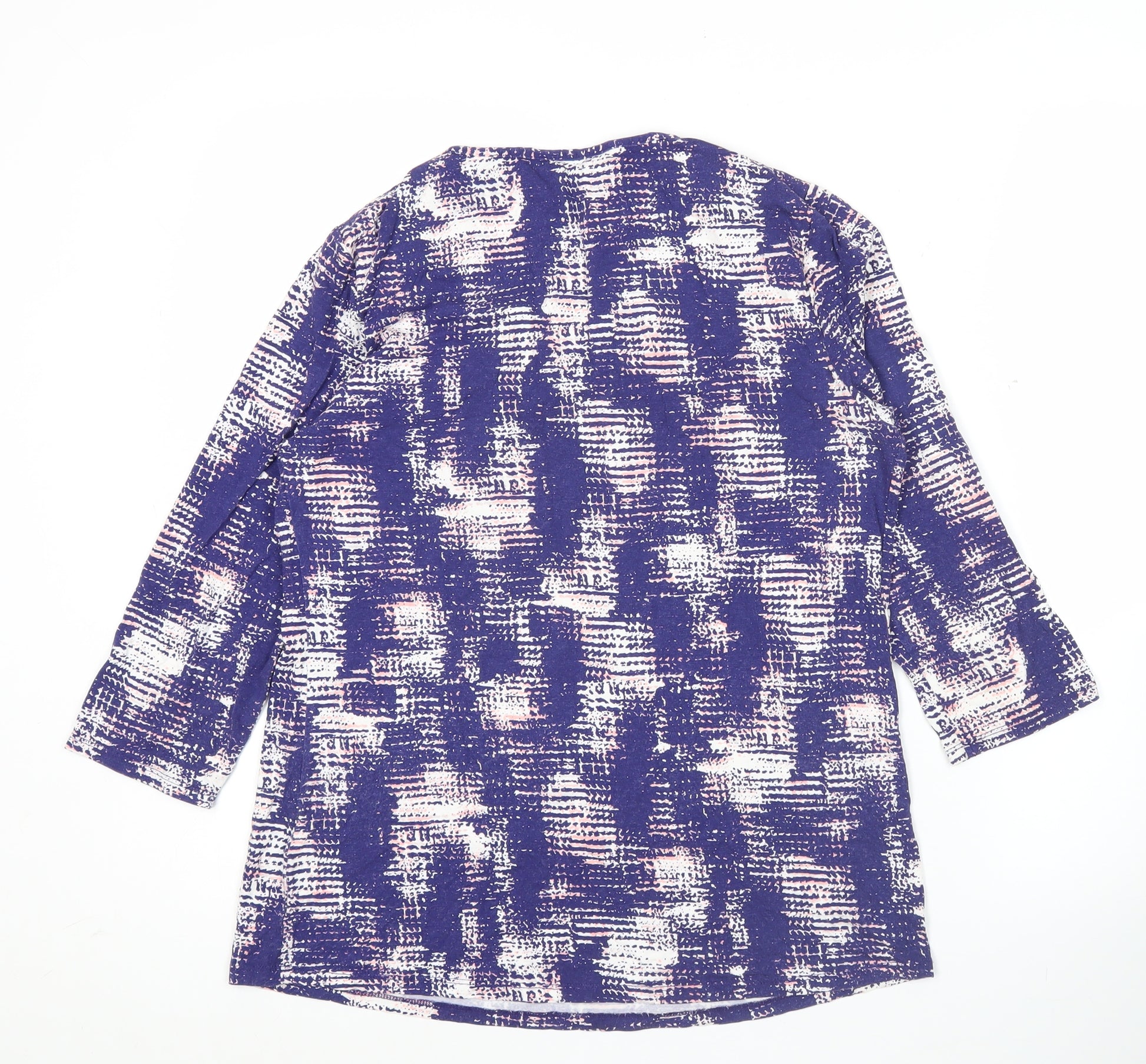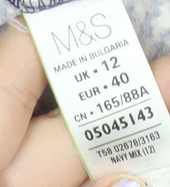 This Marks and Spencer women's blouse is a versatile and stylish piece, perfect for adding a touch of effortless elegance to your wardrobe. Designed in a tunic style, this blouse offers a flattering fit with a comfortable pullover closure that makes it easy to wear. It comes in a striking multicoloured abstract geometric pattern dominated by deep navy tones with lighter contrasting highlights, making it a stand-out piece for casual and smart-casual settings. Tailored from a soft and breathable jersey fabric, this top is made from 96% viscose and 4% elastane, ensuring a lightweight stretch and flexible fit for lasting comfort. The scoop neckline provides a soft feminine touch, while the 3/4 length fitted sleeves strike the perfect balance between style and practicality, making this an excellent transitional wardrobe piece across seasons. Designed as a regular size UK 12, this blouse is ideal for day-to-day wear, whether paired with jeans for casual outings, skirts for workwear, or trousers for relaxed weekend gatherings. The fabric choice and cut provide a relaxed drape while still maintaining structure, ensuring a flattering look. Care is simple with this machine washable piece; its low-maintenance qualities add extra appeal for a busy lifestyle. Suitable for spring, summer, and autumn, this blouse can be styled across occasions, offering flexibility as both a casual essential and a smart workwear option. The gently fitted sleeve design and regular fit cut mean it wears beautifully on its own or layered under jackets and cardigans, creating effortless looks across your wardrobe. Condition is excellent, with no defects, and it has been lightly worn with good care. A high-quality and timeless Marks and Spencer classic, this blouse brings unrivalled durability, comfort, and versatility to your collection, and at this affordable price it offers excellent value. A perfect choice for everyday sophistication with a modern twist.