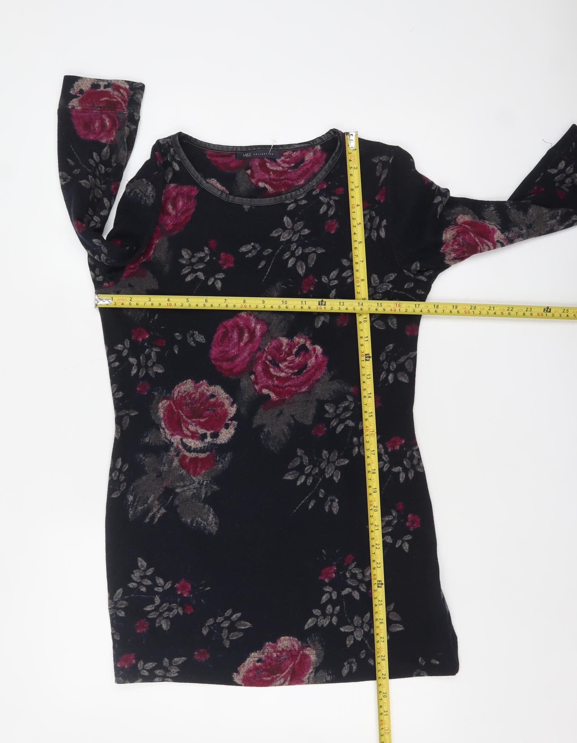 This elegant Marks and Spencer Women's Jumper in a multicoloured floral design blends sophistication and comfort effortlessly. Crafted from a soft, stretchy knit fabric made of 97% polyester and 3% elastane, the material ensures both durability and comfort. With its close-fitting yet flexible feel, this pullover is perfect for everyday wear while maintaining a flattering silhouette. The medium-weight knit combined with the floral print in rich shades of red and grey against a deep navy base gives this jumper a timeless yet chic appeal. Designed with a classic crew neckline and practical 3/4 length sleeves, this jumper offers a versatile look that transitions easily from casual outings to smart-casual settings. The regular fit ensures ease of movement, making it ideal for layering over a shirt or under a jacket during cooler months. The floral pattern introduces a feminine vibrance that keeps your style fresh across seasons, particularly well-suited to autumn, winter, and early spring. Marks and Spencer, known for their reliable quality and timeless fashion, deliver another wardrobe essential with this piece. Its machine washable nature makes it low-maintenance, while the slight elastane content adds just enough stretch for lasting shape and comfort. With no visible flaws or imperfections, this pre-loved jumper is in excellent condition and ready to bring sophisticated comfort to your collection. Whether paired with jeans for a relaxed weekend look or dressed up with a skirt and boots, this floral jumper adds a flattering, elegant touch without sacrificing comfort or practicality. A beautiful, high-quality choice for women who appreciate enduring style and comfort. Perfect for everyday wear, casual gatherings, or smart daytime looks.