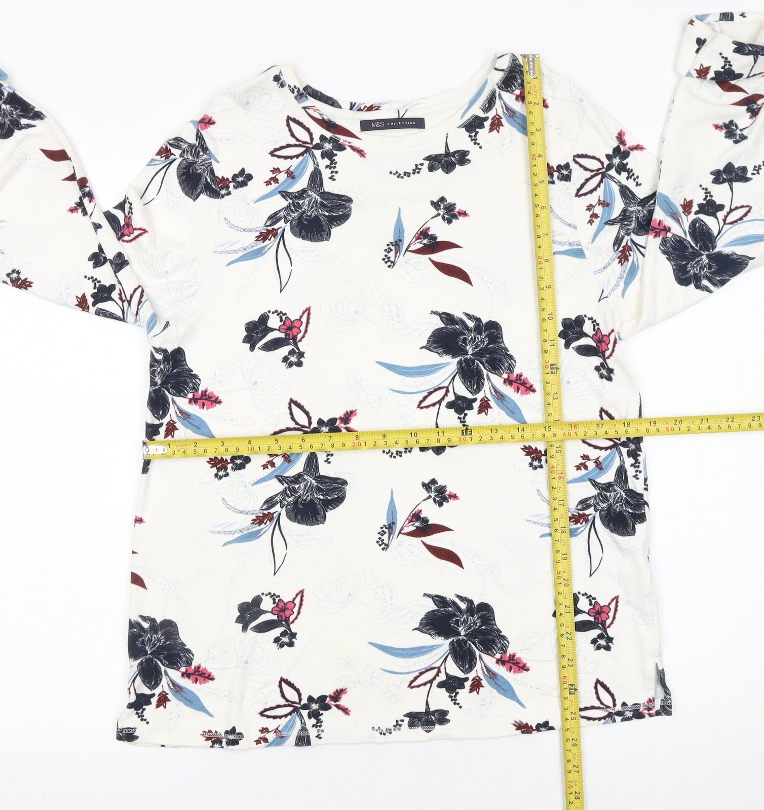 Elevate your everyday wardrobe with this stylish Marks and Spencer Women’s Long Sleeve Floral Jersey T-Shirt in size 14. Crafted from a soft and breathable blend of viscose and elastane, this top offers a comfortable fit that moves effortlessly with the body. The fabric’s natural stretch enhances shape retention, making it ideal for all-day wear. Featuring a flattering crew neckline and classic fitted long sleeves, this piece combines versatility and elegance for modern, casual styling. The charming floral print in shades of navy, pink, and blue creates a fresh and feminine aesthetic that pairs beautifully with jeans, skirts, or chinos. Its lightweight feel makes it suitable for layering, whether under cardigans in cooler months or worn alone through spring and summer. Designed in a regular fit, the pullover style promises ease and comfort without compromising on a polished look. The fabric’s jersey texture provides a smooth, soft touch against the skin, while the subtle stretch ensures flexibility and comfort in everyday activities. Perfect for casual outings, lunches, or relaxed office days, this Marks and Spencer top embodies timeless British design with effortless wearability. Machine washable for ease of care, it retains its colour and shape wash after wash. In excellent pre-loved condition with minimal signs of wear, it’s a superb choice for those who value quality and comfort. A staple item that blends practicality with style, this floral M&S top is a perfect addition to a modern woman’s collection, bringing confidence and charm to any outfit combination. A must-have for women who love comfortable yet chic pieces for daily wear or weekend relaxation.