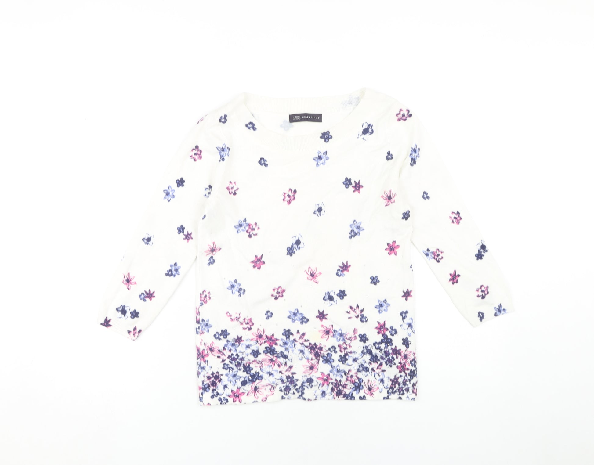 Add a touch of spring to your wardrobe with this delightful Marks and Spencer Women's Pullover Jumper. Decorated with a vibrant multicoloured floral print, this tight-knit piece exudes both elegance and comfort. The boat neck design complements its relaxed fit, making it ideal for casual outings or a day at the office. Designed for all-day wear, this jumper features long sleeves that provide warmth without sacrificing style. Crafted from a soft and breathable blend of 83% viscose and 17% polyamide, it promises both durability and comfort. This stunning jumper is machine washable, ensuring easy care and maintenance. Perfect for the fashion-conscious woman, its excellent condition verifies its high quality and versatile nature. Whether paired with jeans for a casual look or dressed up with trousers for an evening out, this jumper will make an exquisite addition to your wardrobe. Ideal for spring and autumn, its versatility and timeless design will ensure it remains a favourite for years to come.