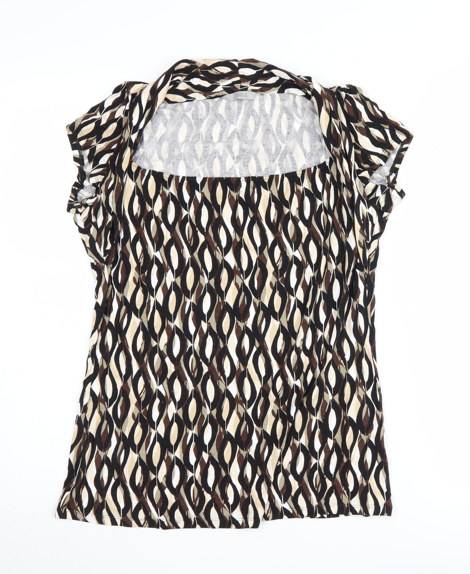 Elevate your wardrobe with this Marks and Spencer Women's Top, featuring a chic multicoloured geometric pattern. This stylish blouse is designed for a regular fit, making it perfect for casual outings. The short cap sleeves and collared neckline add a touch of elegance, while the easy-care jersey fabric ensures a gentle feel on the skin. Crafted from 94% Viscose and 6% Elastane, it offers a comfortable stretch for all-day wear. Highlighted by its retro theme and pullover closure, this blouse is machine washable for convenience. Ideal for any season, it's a versatile addition to your collection. Get yours now and enhance your style with a mix of sophistication and comfort.