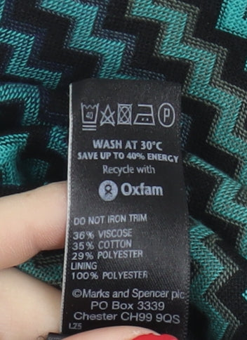 Explore elegance with this stunning women's pencil skirt from Marks and Spencer. Crafted from a blend of viscose and polyester, the skirt promises a comfortable fit with a touch of sophistication. The eye-catching multicoloured geometric pattern adds a modern twist to a classic design, making it a versatile addition to any wardrobe. Ideal for various occasions, this knee-length skirt is perfect for any season and can easily transition from workwear to a casual evening outing. The skirt features a convenient zip closure at the back, ensuring a snug fit while maintaining style. Machine washable for easy care, this skirt offers an effortless blend of convenience and fashion. Whether paired with a chic blouse for the office or a casual top for a more laid-back look, this Marks and Spencer skirt is a must-have for every fashion-forward woman.