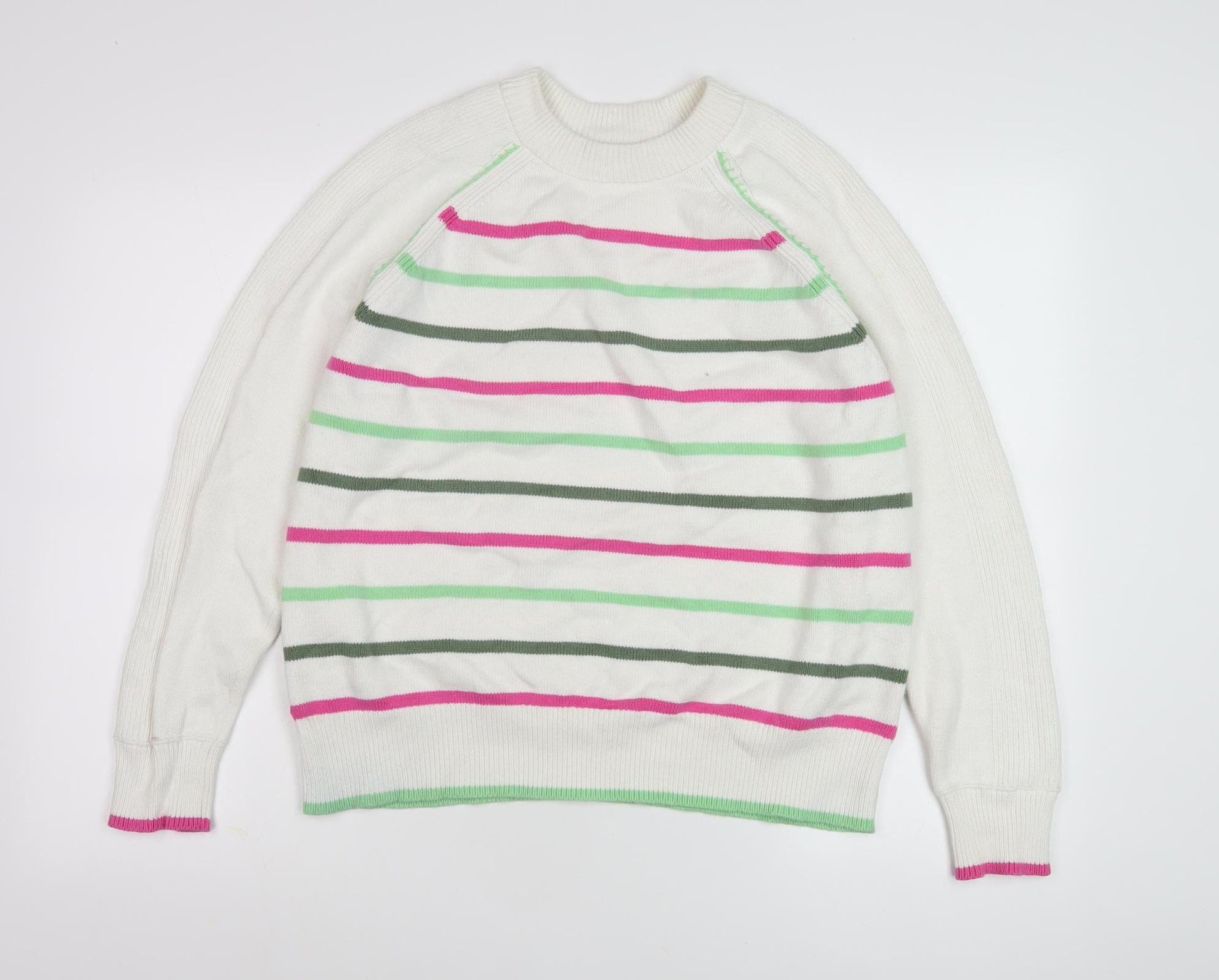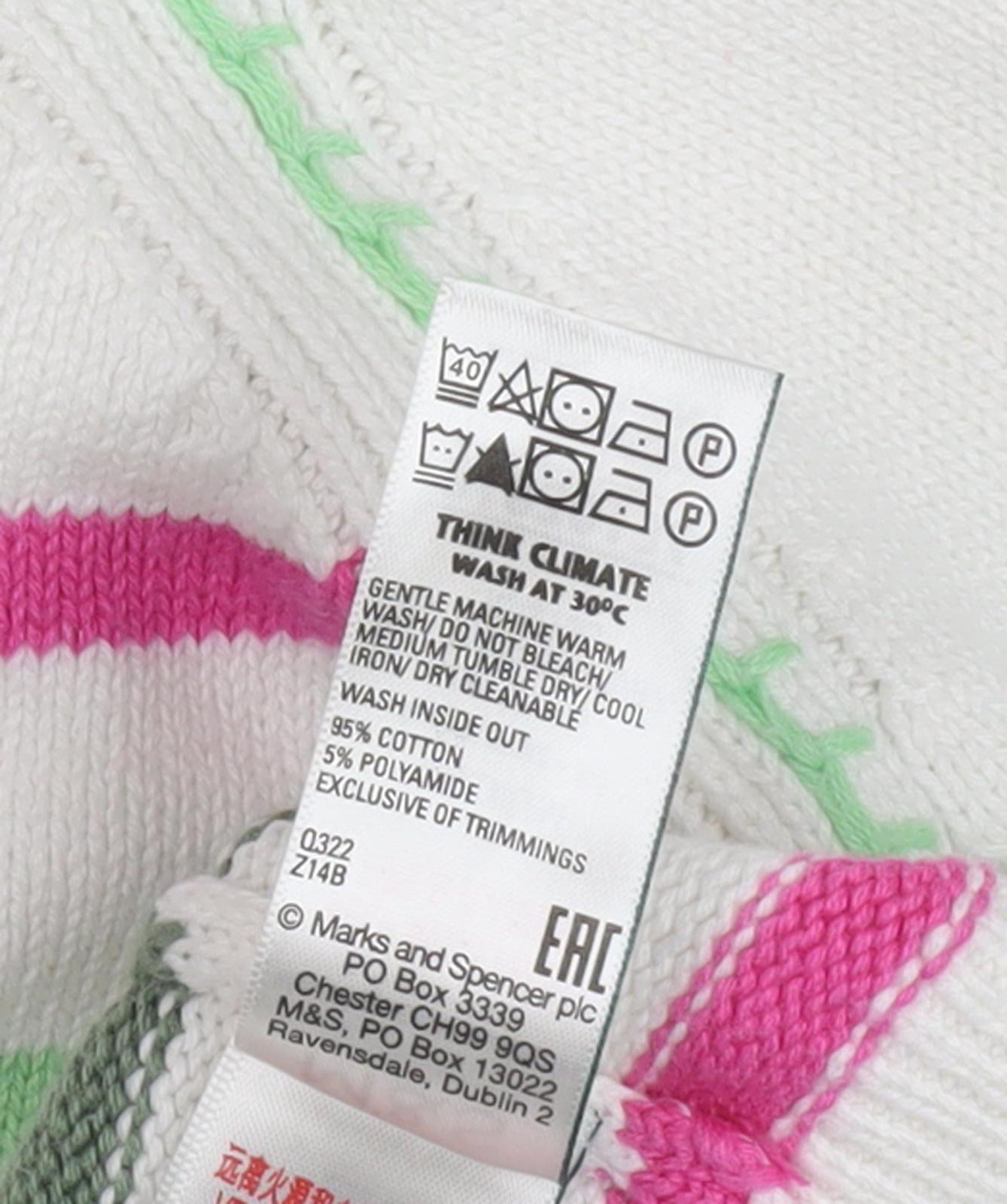 Embrace comfort with style in this vibrant Marks and Spencer Women's Striped Pullover. Crafted from a soft blend of 95% cotton and 5% polyamide, this knit jumper offers both warmth and breathability, perfect for casual wear. The multicoloured stripes in green, pink, and grey add a playful touch to your wardrobe, making it a versatile piece for any casual occasion. Designed with long raglan sleeves for a relaxed fit, and a classic crew neckline to enhance comfort around the neck. Despite being pre-owned, it is in excellent condition with only slight discolouration on the sleeve, ensuring longevity and style. Perfect for layering in cooler seasons or as a standalone piece for a laid-back look.