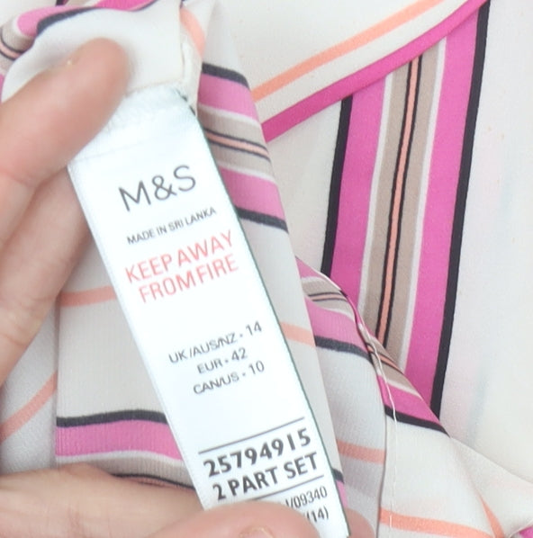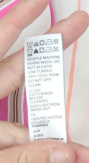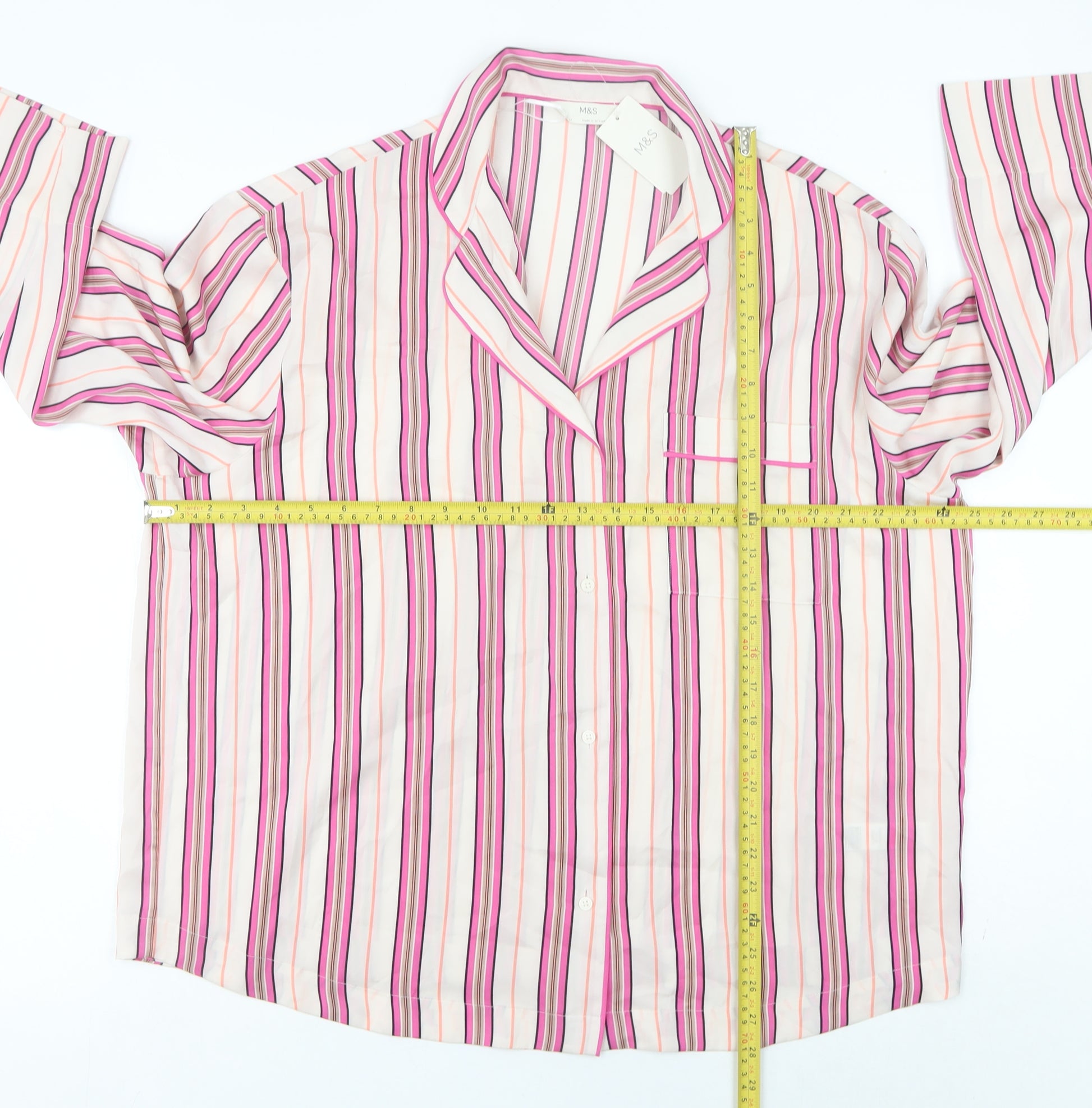Elevate your nightwear collection with this elegant Marks and Spencer women's pyjama top, designed for comfort and style. Crafted from 100% polyester satin, this top offers a smooth and lightweight feel against the skin, perfect for a restful night's sleep or lounging around the house in style. The multicoloured striped pattern blends shades of pink, cream, black, and coral, offering a vibrant yet sophisticated look. Designed in a classic shirt style, it features a collared neckline, long sleeves, and a front button closure for ease and convenience. The top includes a single breast pocket accented with neat piping, adding a touch of refined detail. Its lightweight polyester fabric makes it ideal for spring, summer, and autumn wear, ensuring breathability and comfort throughout the night. With a regular fit in a UK size 14, this piece provides a flattering silhouette while allowing comfortable movement. This pyjama top forms part of a coordinated two-piece set, but can easily be paired with your favourite lounge or sleepwear bottoms for added versatility. Easy to care for, it's machine washable, ensuring it stays fresh and ready to wear with minimal effort. Whether you’re treating yourself or gifting someone special, this Marks and Spencer pyjama top offers both practicality and charm. Perfect for women who value both comfort and a polished night-time look, it delivers quality craftsmanship from a trusted British high-street brand. Add this affordable, premium-feel pyjama top to your collection and make evening relaxation and weekend lounging a more indulgent experience. Pair it with the matching bottoms for the full coordinated effect, or mix and match with other nightwear items for a touch of personal flair.