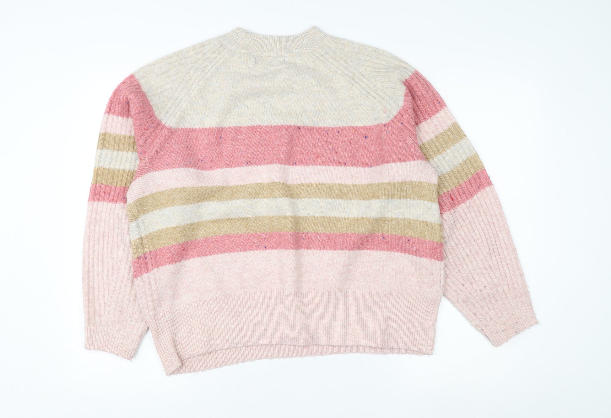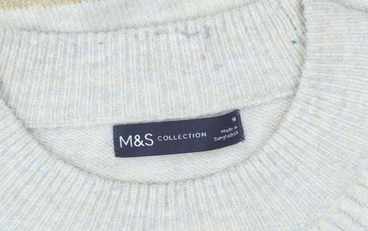 Bring warmth and classic charm to your wardrobe with this beautiful multicoloured striped jumper by Marks & Spencer. Expertly crafted using a soft and cosy blend of wool, acrylic, and polyester, this ribbed knit pullover provides ultimate comfort while maintaining a stylish, easy-to-wear silhouette. The crew neckline lends a timeless look that pairs seamlessly with jeans, skirts, or trousers, making it a versatile addition to your everyday autumn and winter outfits.Featuring horizontal pastel-toned stripes in pink, beige, cream, and khaki shades, this jumper embodies a relaxed yet sophisticated feel. The regular fit and long raglan sleeves allow freedom of movement and enhance comfort, perfect for layering over shirts or under coats as the weather cools down. Lightweight yet warm, it’s ideal for casual settings, weekend strolls, or cosy gatherings.Marks & Spencer is synonymous with quality and comfort, and this jumper reflects that heritage perfectly. The luxurious wool blend ensures a soft feel against the skin, while its durable knit maintains its shape after wear. The ribbed hem and cuffs give a structured finish, offering a flattering silhouette suitable for a variety of body shapes.Whether you're creating a relaxed work look or enjoying a laid-back day out, this jumper delivers enduring appeal with minimal effort. Its striped design adds personality without being overpowering, making it a reliable go-to for multiple occasions. Pair it with denim jeans and ankle boots for a cosy everyday look, or dress it up slightly with a midi skirt and neutral accessories.Sustainably made from high-quality fibres, this jumper represents the thoughtful, stylish comfort that Marks & Spencer is loved for. Easy to care for and machine washable, it fits seamlessly into your lifestyle — giving you a chic, comfortable, and dependable piece season after season.