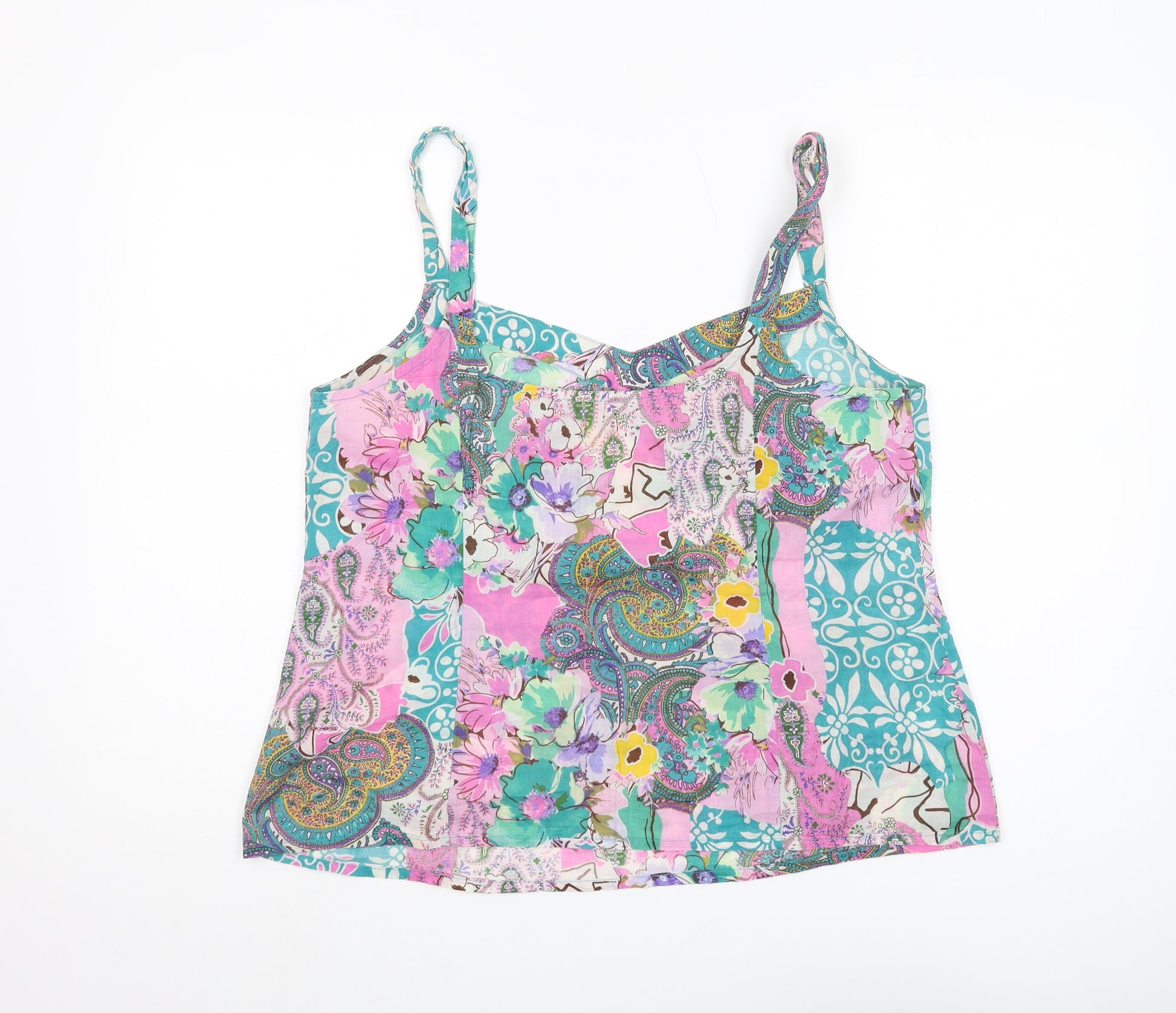 Introducing this charming Marks and Spencer tank top, an essential addition to any summer wardrobe. Designed for everyday wear, this women's camisole offers a delightful multicoloured floral and paisley pattern, perfect for adding a splash of colour to your casual outings. Made from 100% cotton, this piece ensures breathability and comfort throughout the day. Its woven fabric type and lightweight features make it an effortless choice for those warm summer days. Featuring a flattering sweetheart neckline and spaghetti straps, this top provides a stylish and relaxed fit. With easy care in mind, it is machine washable, making maintenance a breeze. Whether you're out for a casual day in the city or enjoying a laid-back beach outing, this tank top is the epitome of versatile fashion. Order yours today and bring an element of fresh elegance to your summer style.