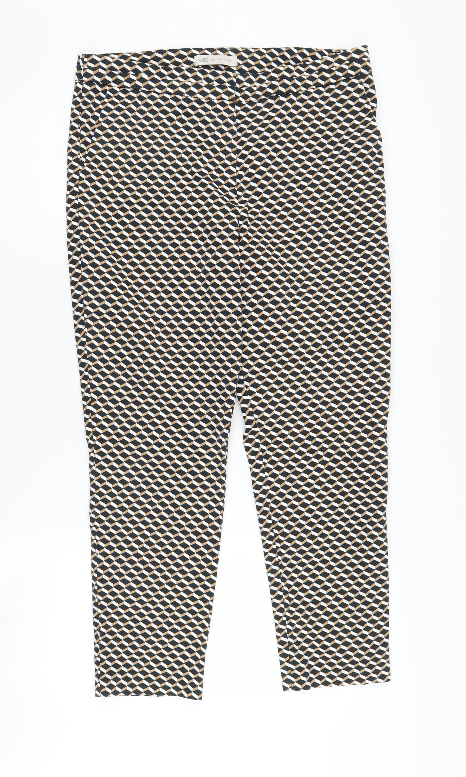 Step into these chic Marks and Spencer women's trousers that promise to add a splash of style to your wardrobe. Designed with a striking geometric pattern in a delightful multicoloured palette, these trousers are perfect for casual outings and casual occasions. Tailored in a regular fit, they offer the right balance of comfort and fashion, ensuring you look fabulous while feeling at ease. Expertly crafted from a blend of cotton and elastane, these trousers provide a comfortable stretch, ideal for all-day wear. The flattering mid-rise design and straight leg style make them suitable for a variety of body types, enhancing your silhouette elegantly. These trousers are made with high-quality materials that are easy to care for, being fully machine washable. Whether you pair them with a crisp white blouse or a casual knit top, they're versatile enough to match any top with ease. These trousers are brand new, featuring the original sales tags attached, ensuring pristine condition for your satisfaction. Don't miss the opportunity to add these fabulous Marks and Spencer trousers to your collection and enjoy the perfect blend of style and comfort!