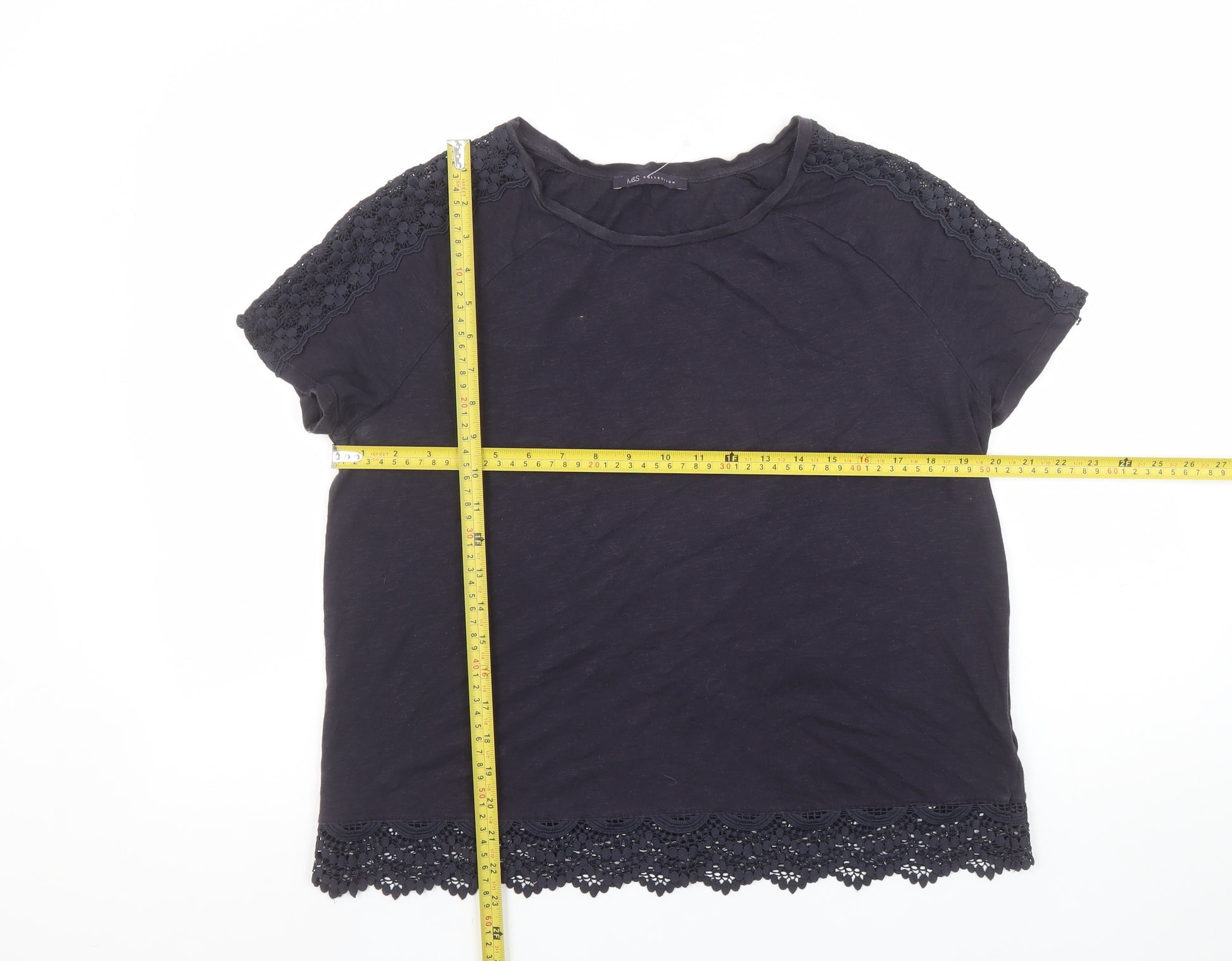 Women's Navy Crochet Trim Cotton T-Shirt UK 12