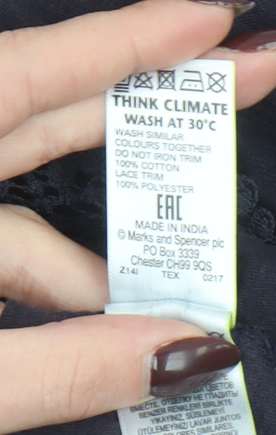 This elegant Marks and Spencer Women’s Navy Crochet Trim Cotton T-Shirt in size UK 12 is a versatile piece that seamlessly fuses comfort with timeless style. Made from 100% soft, breathable cotton, the main body provides a lightweight feel ideal for everyday wear, while the delicate lace trim details—crafted from 100% polyester—add a refined touch of femininity to the overall design. Featuring short sleeves with crochet accents and an intricately finished hemline, this top introduces subtle texture and charm without compromising practicality. The classic crew neckline ensures a flattering fit, making it perfect for layering under jackets or wearing on its own. Designed in a regular fit, it offers ease of movement and a relaxed yet polished silhouette. The deep navy colour complements a wide variety of wardrobe combinations, presenting endless styling possibilities. Pair it with jeans for a casual daytime look, or tuck it into a skirt with simple accessories for a more elevated, evening-ready ensemble. Easy to care for and machine washable, this garment embodies M&S’s commitment to quality and sustainability through its “Think Climate” label, encouraging a 30°C wash cycle. Ideal for spring and summer yet versatile enough to style throughout autumn, this piece is perfect for women who value modern simplicity with a touch of artisan craftsmanship. Whether worn for relaxed weekends, coffee dates, or casual Fridays, it brings effortless elegance to your outfit. In excellent pre-loved condition, this T-shirt shows light signs of wear with no visible damage. It’s ready to bring comfort, charm, and quality to any fashionable wardrobe — offering Marks and Spencer’s trusted heritage in a beautifully understated design that feels good and looks even better.