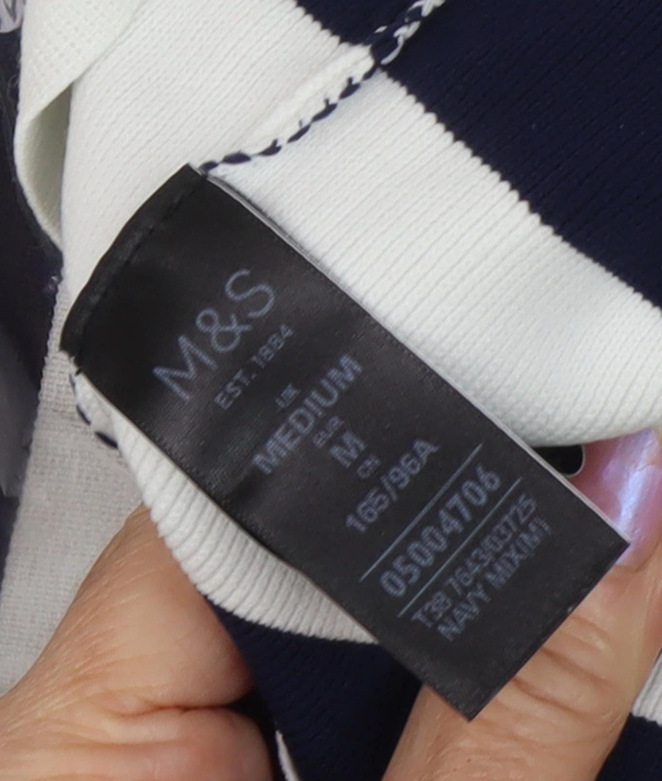Elevate your casual wardrobe with this Marks and Spencer navy and white striped poncho. Perfect for the spring and summer seasons, this relaxed-fit garment offers both style and comfort. Crafted from a soft knit fabric with a predominant cotton composition, it ensures exceptional breathability and a lightweight feel. The boat neck design adds a touch of elegance, making it easy to slip on over any outfit. Featuring a nautical theme with a classic striped pattern, this jumper is ideal for casual outings or seaside adventures. Whether you're pairing it with jeans or skirts, its versatile style suits any casual occasion. Despite being pre-loved, it’s in excellent condition, with just a small mark on the fabric. Don't miss out on this stylish addition to your collection for a tidy £15.00.