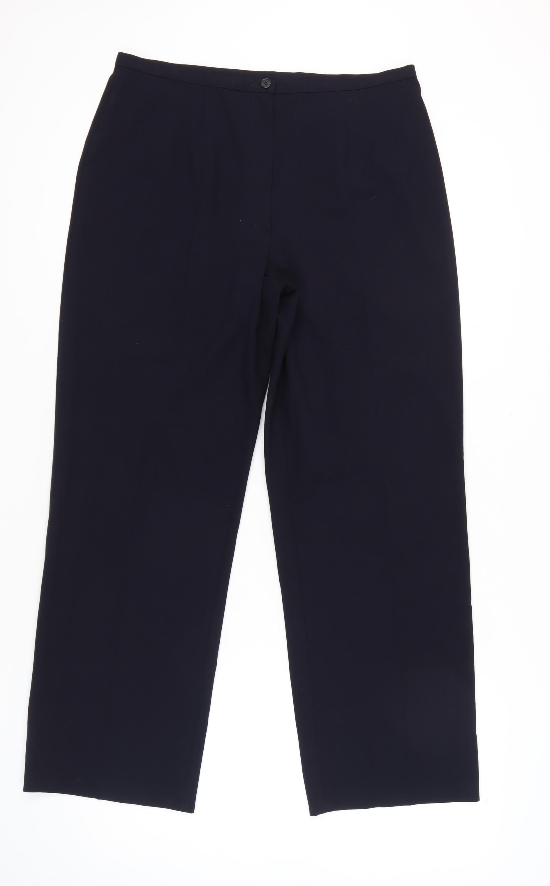 Step into timeless elegance with these Marks and Spencer women's trousers. Crafted with a detailed blend of materials, these trousers boast a comfortable yet durable build. Made with 47% polyester, 47% viscose, and 6% elastane, they offer just the right stretch for all-day comfort. The classic dark navy colour ensures a versatile addition to your wardrobe, pairing well with many styles whether for casual wear or a more formal setting. Featuring a flat front design and a mid-rise fit, they offer a streamlined silhouette that's both flattering and professional. Designed with an easy button closure, these trousers fit seamlessly against your body, accentuating a classic straight-leg style. Their machine-washable nature means less time in maintenance, allowing you more time to focus on the important things in life. These trousers are in excellent condition, appearing hardly worn and preserving their original structure and style. Perfect for days when style and comfort are both priorities. Add a touch of sophistication to your day with these classic trousers.
