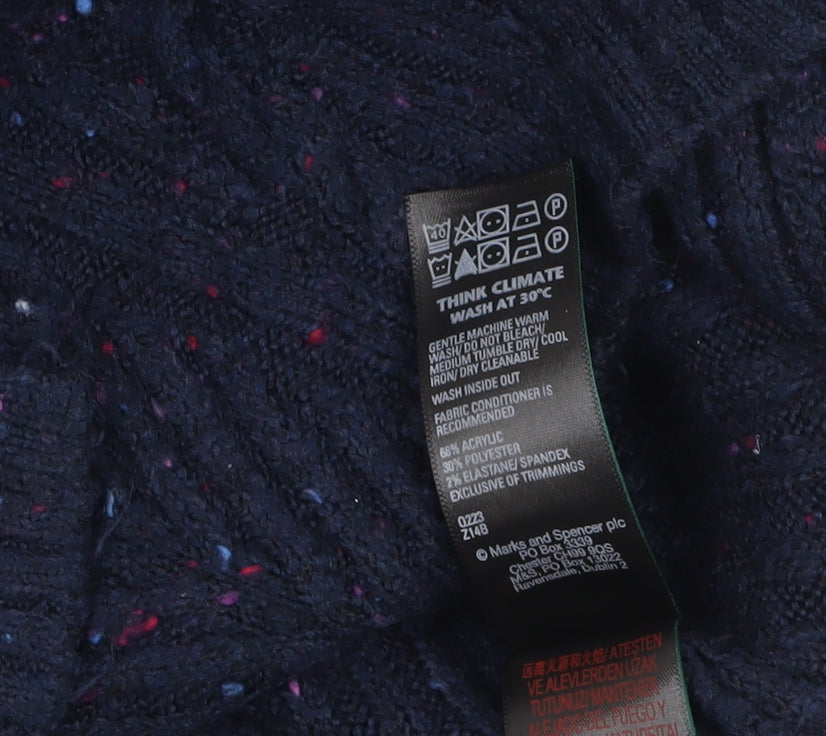Stay cosy and stylish with this navy Marks and Spencer women's half zip jumper, perfect for chilly days and cosy nights. Made from a soft and stretchy blend of acrylic, polyester, and elastane, it offers both warmth and comfort without feeling heavy. The high neckline with a sleek silver-tone zip accent adds a touch of modern charm, making this piece versatile enough to pair with jeans for a casual weekend or smart trousers for a polished daytime outfit. Its textured rib knit design creates a flattering fit that gently hugs the body while maintaining a relaxed silhouette, perfect for layering over shirts or wearing on its own. Designed for comfort and practicality, this jumper features long raglan sleeves for ease of movement and a slightly longer hemline for added coverage. The durable machine washable material ensures easy maintenance, while the soft knit fabric delivers lasting comfort season after season. Ideal for autumn and winter wear, this Marks and Spencer half zip jumper is a wardrobe essential for those who appreciate effortless style. With its clean design and minimal detailing, it adapts easily to any outfit, transitioning seamlessly from weekday to weekend. Whether you're heading out for a walk or relaxing indoors, it offers everyday luxury with timeless appeal. In excellent pre-loved condition with no visible flaws, this women's jumper promises reliable quality and enduring wear. A perfect combination of practicality and understated elegance, ready to become your next go-to knitwear piece.