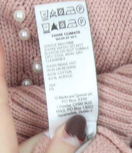 Wrap yourself in comfort and understated elegance with this beautiful Marks and Spencer women’s pink beaded jumper. Designed in a soft cotton-acrylic blend, this lightweight knit ensures all-day comfort while maintaining a premium feel. The dusty blush pink shade adds a charming and versatile touch to your wardrobe, perfect for pairing with jeans for a relaxed outing or a tailored skirt for a refined casual look. The delicate beadwork arranged in an argyle diamond pattern enhances its feminine appeal, adding just the right amount of texture and shimmer without being overbearing. Crafted with care, this crew neck pullover features a ribbed hem, cuffs, and neckline that offer a snug fit while maintaining flexibility and comfort. The regular fit and long sleeves make it an ideal layering piece for cooler autumn and winter days, while the breathable knit keeps you cosy without overheating. Its classic yet contemporary design makes this piece timeless — suitable for casual days, workwear, or social gatherings where smart comfort is key. Marks and Spencer’s signature quality and thoughtful detailing shine through, making it an essential piece for any wardrobe. The easy-care fabric is machine washable, adding convenience to your daily routine. Whether you’re after something effortlessly chic for weekend brunches, or simply looking to update your knitwear collection, this jumper offers style, comfort, and understated luxury. Own a versatile piece that embodies classic British design and everyday practicality, perfect for elevating your seasonal look while keeping you comfortably stylish wherever you go.