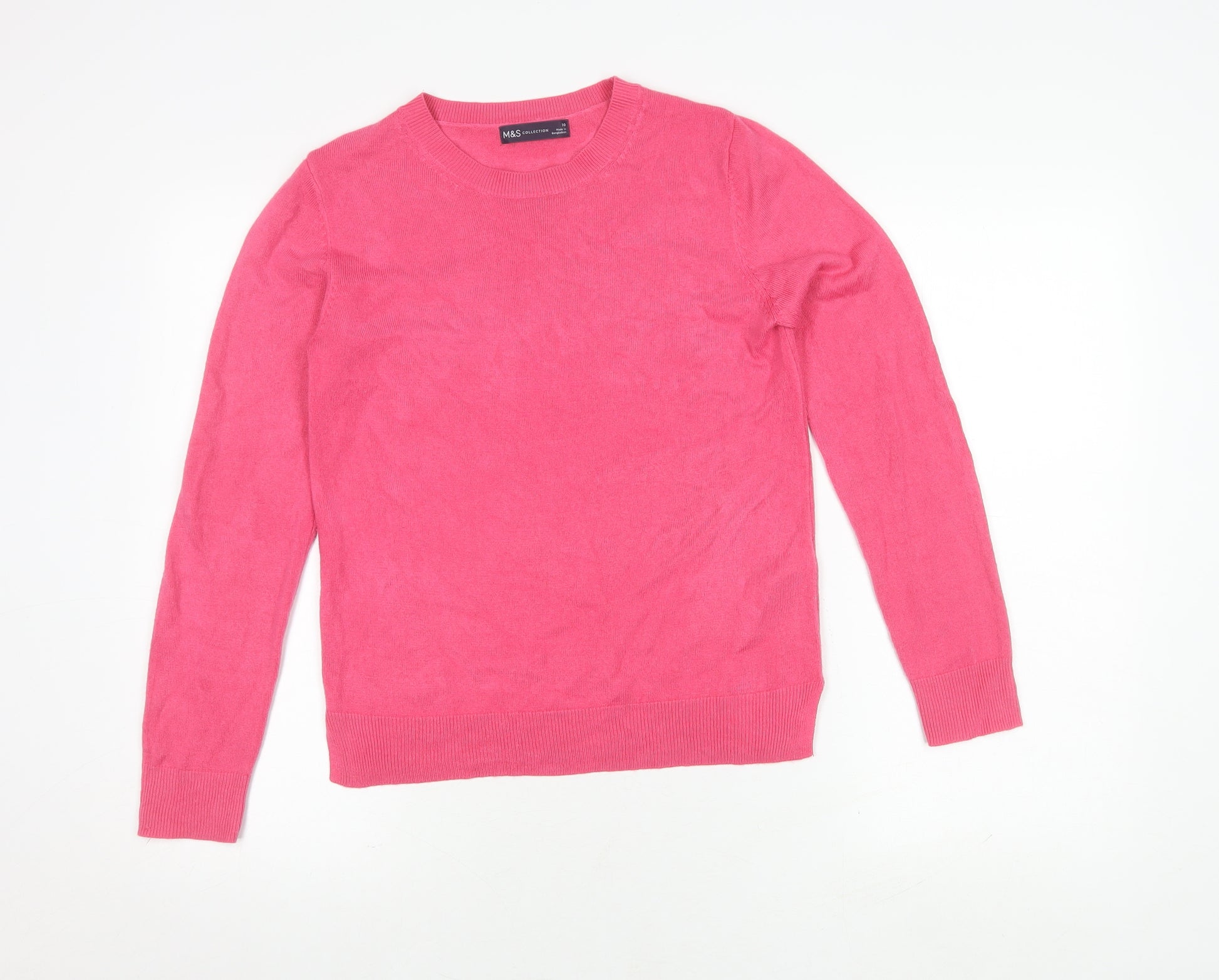 Add a pop of colour to your wardrobe with this vibrant pink pullover jumper from Marks and Spencer. Designed for women, this classic crew neck jumper is perfect for casual occasions. Made from 100% acrylic, it offers warmth and comfort while being easy to care for with machine washable convenience. Its regular fit and long sleeves make it a versatile choice for layering or wearing on its own during cooler months. The plain design allows for pairing with various outfits, making it a staple piece in any wardrobe. Available in UK size 10, this jumper is both stylish and practical, offering a bright and cheerful addition to your everyday attire. Whether you're heading out for a casual meet-up or simply running errands, this Marks and Spencer jumper ensures you look stylish while staying comfortable. Shop now to update your collection with this must-have piece.