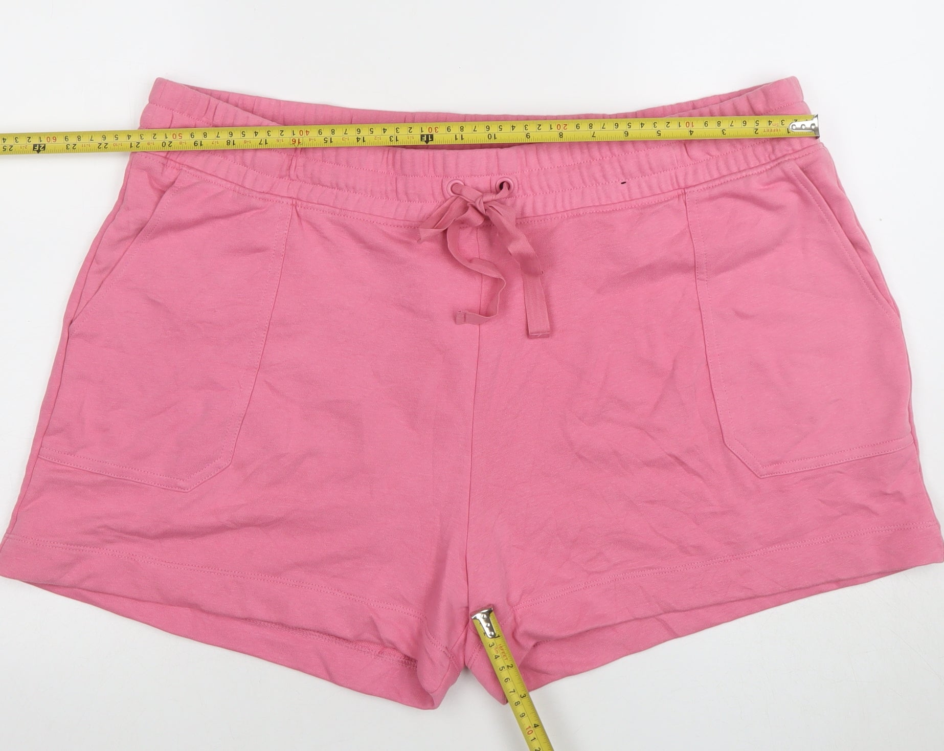 Stay effortlessly comfortable and stylish with these Marks and Spencer Women's Pink Sweat Shorts in size 24. Designed from a soft and breathable cotton blend fabric, these shorts provide a relaxed fit that’s perfect for casual wear, lounging at home, travel, or light activity days. The stretch waistband with an adjustable drawstring ensures a customisable fit, while the smooth jersey fabric adds a touch of everyday luxury. The shorts include practical front slash pockets and a single back patch pocket to keep small essentials handy without sacrificing comfort. Crafted from a high-quality blend of 85% cotton and 15% polyester, the material feels exceptionally soft on the skin while maintaining durability through frequent wear and washing. The pink tone adds a cheerful summer vibe, flattering and feminine without being overpowering. Ideal for warm spring and summer weather, these sweat shorts are breathable, easy to pair with a vest, relaxed T-shirt, or hoodie, and perfect for running errands, walking, or lounging. Marks and Spencer's attention to detail shines through in the smooth seams, quality stitching, and simple silhouette that flatters the figure while keeping practicality front and centre. The mid-rise waistband offers balanced coverage and comfort. Effortless to care for, they are machine washable and designed to retain shape and softness wash after wash. These shorts show minimal signs of wear, with only light creasing visible and no visible flaws. They would make an excellent addition to any woman’s casual wardrobe. Whether you’re looking for an easygoing summer staple or comfortable loungewear, these pink sweat shorts offer timeless comfort, superb quality, and reliable Marks and Spencer craftsmanship at an affordable price point.