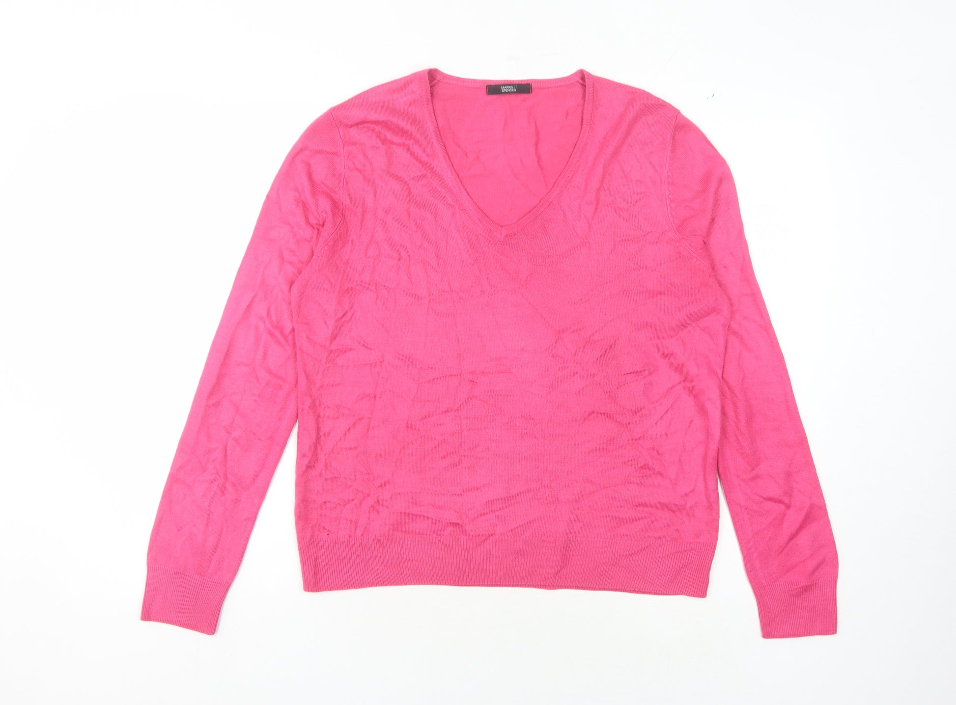 Brighten up your wardrobe with this vibrant pink jumper from Marks and Spencer, perfect for adding a splash of colour to any day. Crafted for the contemporary woman, this women's pullover jumper features a flattering V-neck design, ideal for casual outings or layering over your favourite shirts. Tailored in a size 14, it ensures a comfortable regular fit with its long sleeves keeping you warm during the chilly Autumn and Winter months. Made entirely from high-quality acrylic, this jumper promises durability and comfort. Its machine-washable design makes it easy to care for, while the brand's meticulous craftsmanship guarantees a superb feel on the skin. Though not new with tags, the jumper remains in excellent condition with slightly wrinkled fabric adding a touch of relaxed charm, ready to make an impression. Whether you pair it with jeans for a day out or trousers for a casual office look, this versatile pink jumper is a staple item you'll reach for time and time again. Don't miss the opportunity to embrace comfort and style seamlessly - snag it now at a great price!