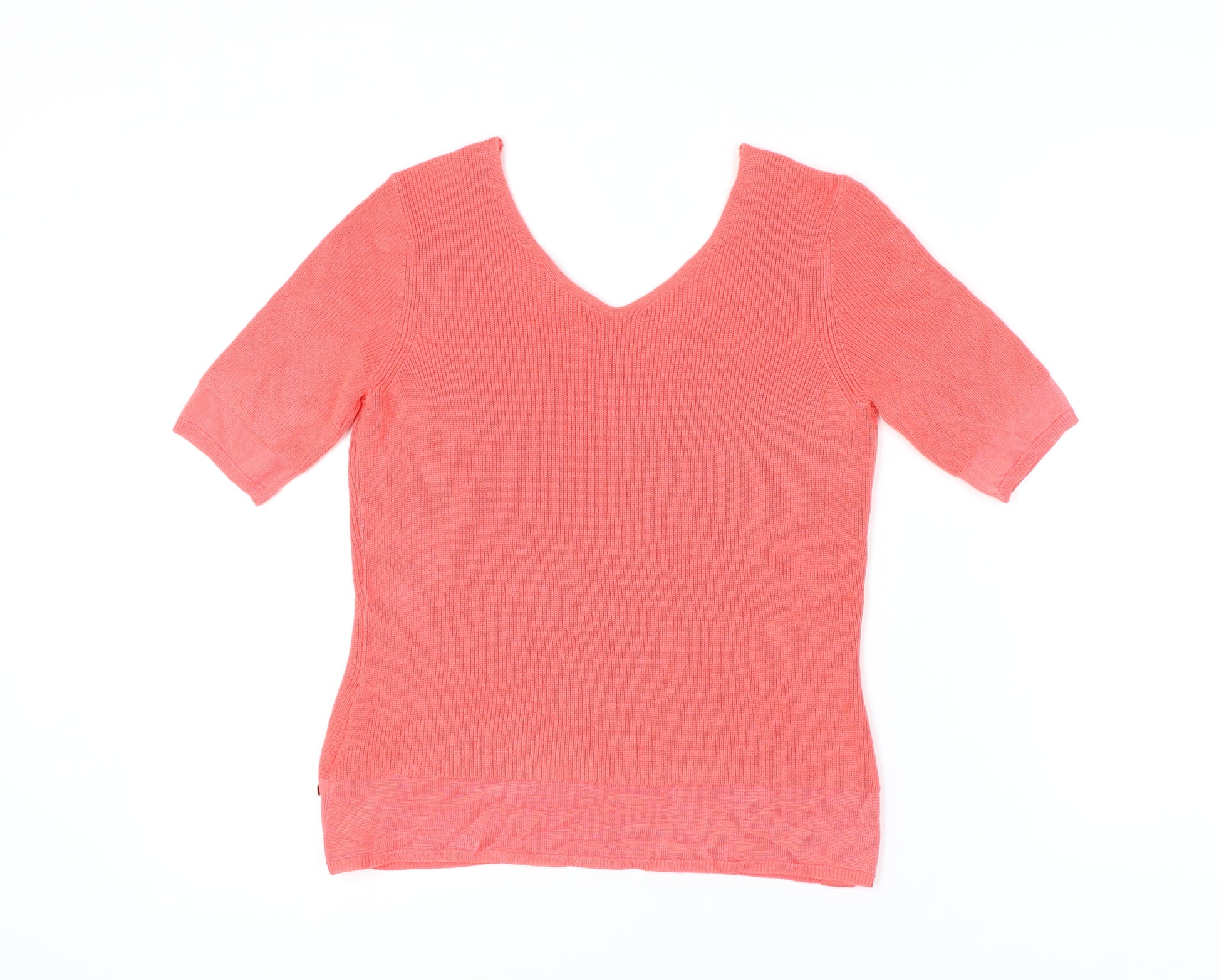 Embrace effortless style with this charming Marks and Spencer women's jumper, a beautiful addition to any wardrobe. Crafted in a soft pink tone, this pullover stands out with its V-neckline, offering a flattering line that accentuates your neck and collarbones. This short-sleeved jumper features a snug fit set to highlight your silhouette, perfect for casual outings or layering during colder seasons. Designed as a regular size type and labeled as a UK size 12, it provides both style and comfort. Made from a blend of viscose and acrylic, this tight-knit piece ensures warmth while maintaining a lightweight feel, ideal for year-round wear. Machine washable, it's easy to care for while retaining its vibrant colour and structure. Subtle button accents add a touch of detail, elevating its simplistic charm. Whether paired with denim for a casual outing or layered over a shirt for a smart casual look, this piece adapts seamlessly. Its excellent pre-owned condition ensures that it remains a fresh and stylish pick for your everyday or leisure activities. Don't miss the opportunity to add a versatile classic to your wardrobe that promises to become a favourite.