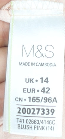 Elevate your wardrobe with this elegant Marks and Spencer women's wrap blouse in a beautiful blush pink shade. Designed to fit a regular UK size 14, this blouse offers a flattering silhouette perfect for both casual and workwear occasions. The sleeveless design keeps it light and breezy, making it an ideal choice for spring and summer seasons.Crafted from a blend of high-quality materials, the main fabric is 100% polyester, while the back is composed of 95% viscose and 5% elastane, ensuring comfort and slight stretch. The blouse features a fashionable V-neck, enhancing its feminine appeal, and a wrap style that adds a touch of sophistication.This solid-patterned blouse is not only stylish but also practical, being machine washable for easy care. Its lightweight nature makes it a versatile piece, easily paired with your favourite skirts or trousers for a polished look.Whether you're heading to the office or enjoying a casual day out, this Marks and Spencer blouse brings a touch of elegance to any outfit. Don't miss the opportunity to add this chic piece to your collection at an affordable price.