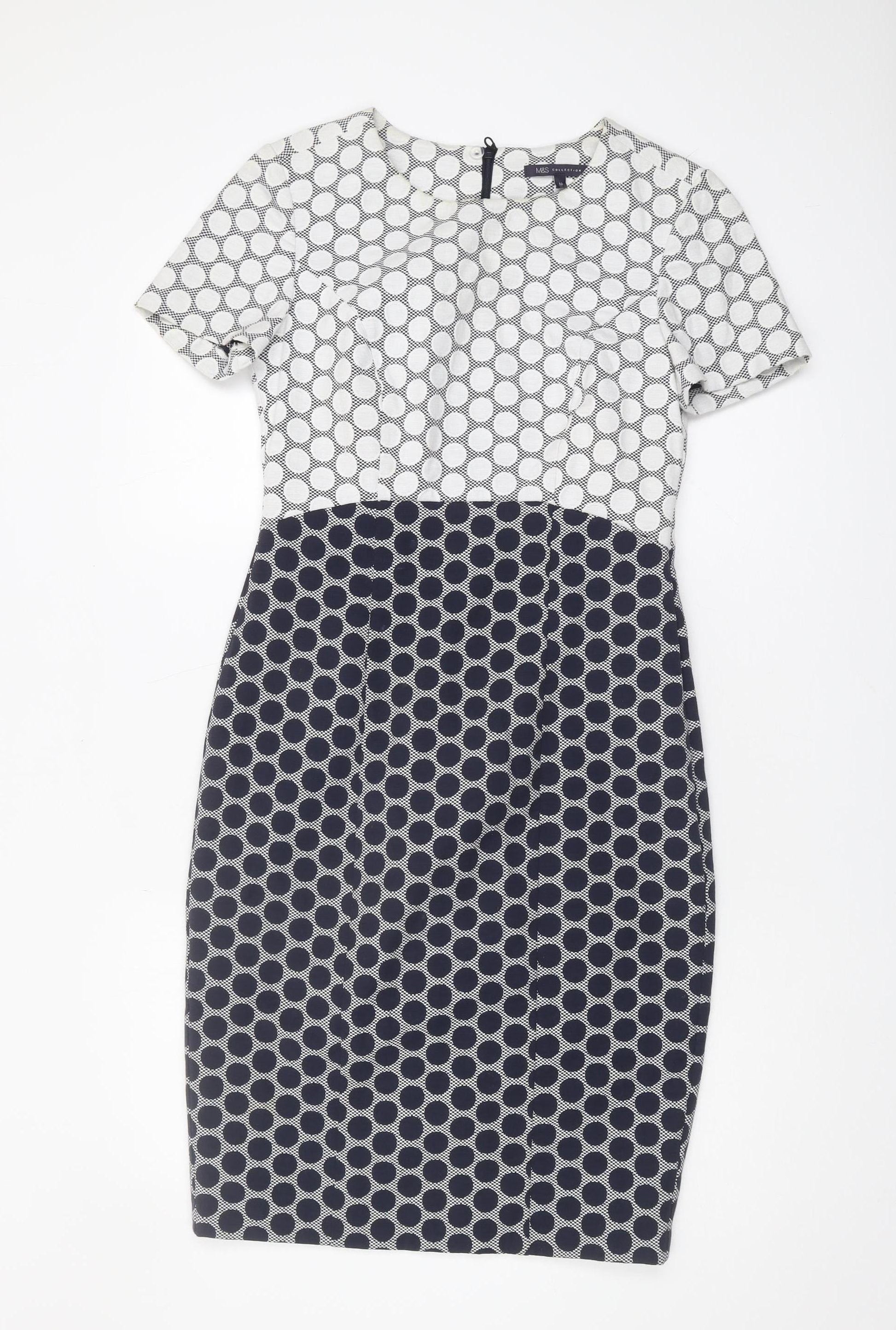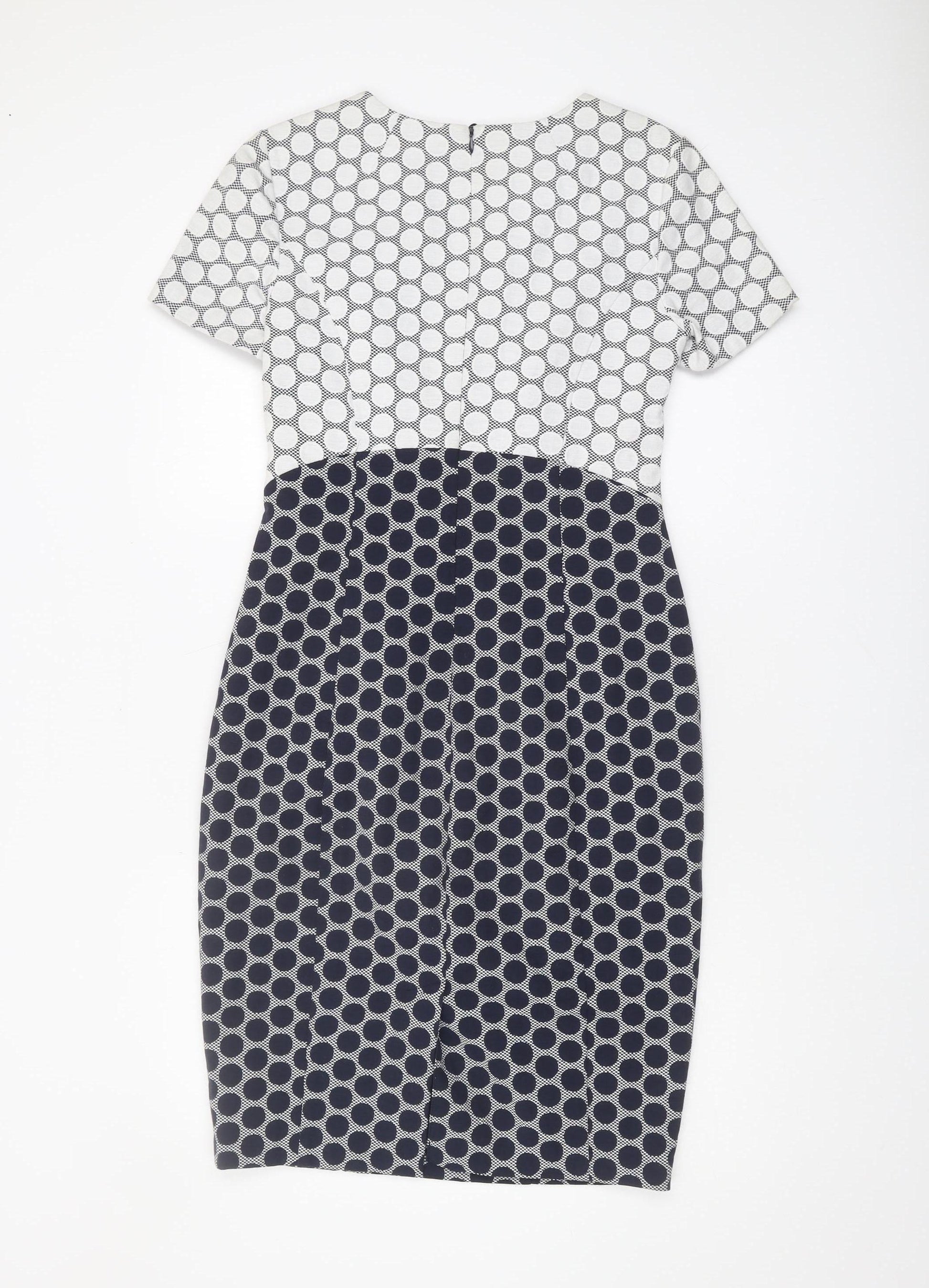 This Marks and Spencer Women's Sheath Dress effortlessly combines a timeless polka dot pattern with a modern silhouette to create a chic and sophisticated look. Crafted from a comfortable cotton blend, this knee-length dress is perfect for the spring and summer seasons, offering breathability and style. The classic combination of black and white polka dots adds a touch of elegance, making it suitable for both business and casual occasions. Featuring a round neck and short sleeves, the dress ensures ease of movement and comfort throughout the day. Its flattering cut is enhanced with a zip closure at the back, ensuring a sleek fit. The garment is machine washable, allowing for easy care and maintenance. Whether you're heading to the office or enjoying a casual day out, this versatile piece is sure to become a staple in your wardrobe. Embrace a look that is both classic and contemporary with this beautifully designed dress.