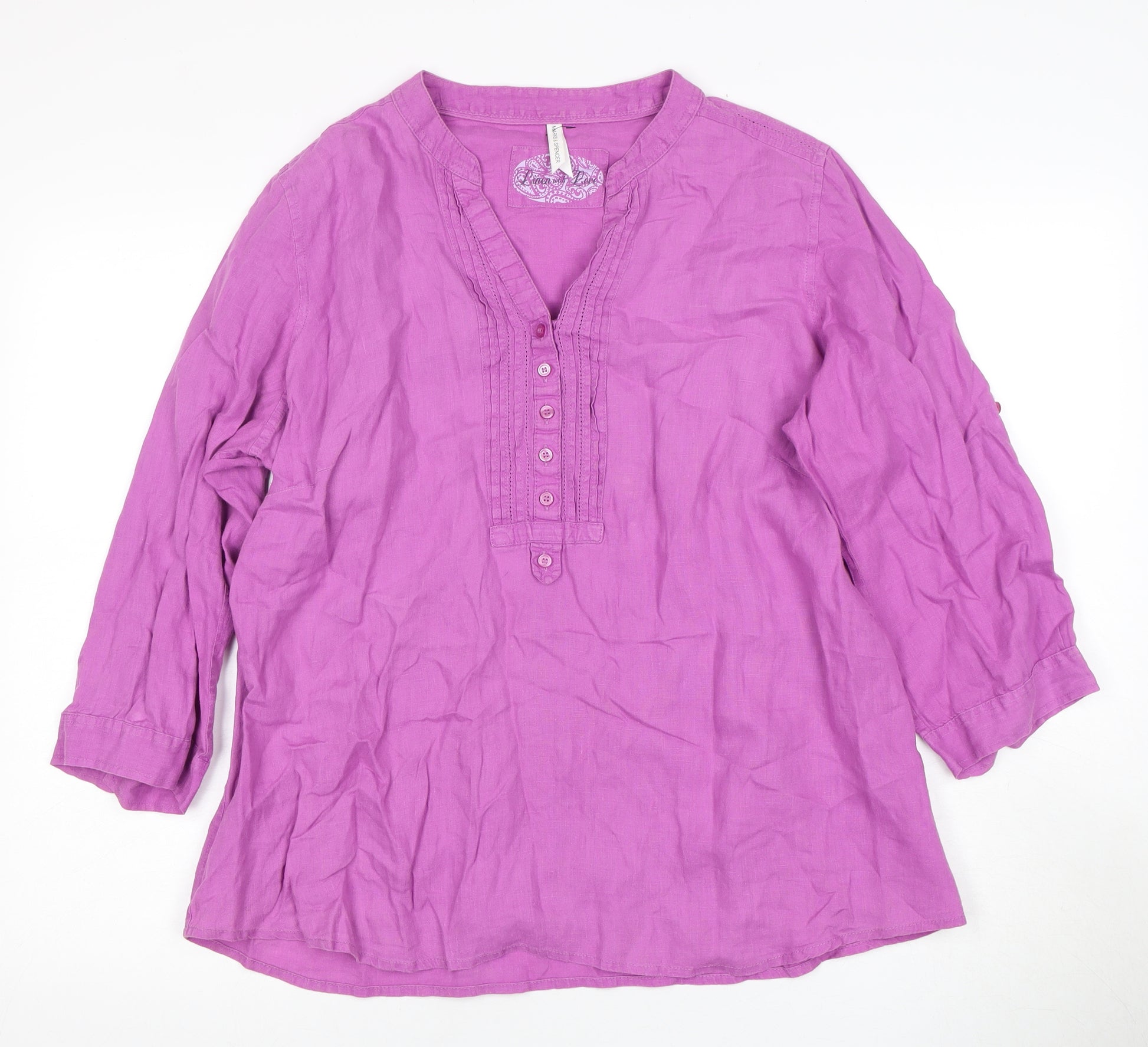 Experience effortless style with this elegant Marks and Spencer women's blouse, crafted for those who appreciate sophistication and comfort in their wardrobe. Tailored in a vibrant purple hue, this 3/4 sleeve blouse offers a delightful splash of colour to brighten any ensemble. Constructed from pure linen, it ensures breathability and comfort, making it an excellent choice for any casual or semi-formal setting. The blouse features a flattering V-neckline and is accented with classic buttons, adding a touch of timeless charm to your look. Designed for versatility, it is suitable for a range of occasions, from a relaxed weekend hangout to a refreshing day at work. Although the blouse shows light wrinkling due to its natural fabric, it remains in excellent condition, promising longevity and ease of care with its machine washable feature. Perfect for women seeking elegance with a casual edge, this piece will effortlessly become a staple in your wardrobe, ideal for pairing with skirts, trousers, or jeans for a chic and polished appearance.