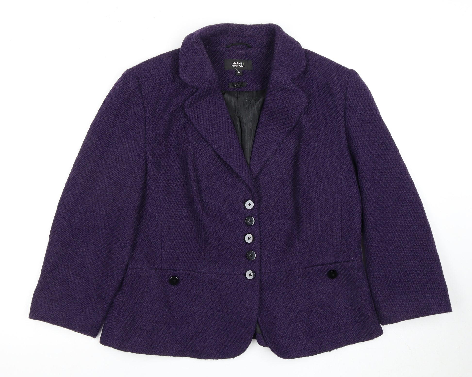 Discover timeless elegance with this Marks and Spencer Women's Blazer, crafted in a sophisticated purple shade. Designed for the modern woman, this blazer is perfect for adding a touch of class to your workwear wardrobe or for creating a chic, stylish look for an evening out. The blazer is expertly tailored in a regular fit and features a classic notch lapel, providing a polished silhouette. With its single-breasted design and three-button front closure, it exudes an air of poise and confidence. Constructed from a quality blend of 70% polyester and 30% wool, this piece offers both warmth and durability, making it ideal for the cooler months of autumn and winter. The woven fabric ensures a refined texture, further elevating the overall design. The interior is lined with 100% polyester, offering a smooth and comfortable fit against the skin. The jacket is detailed with three-button sleeves, aligning with a sophisticated, understated style. Additionally, the blazer is dry clean only, preserving its structure and appearance after multiple wears. Whether you're heading to the office, attending a formal event, or looking to enhance your everyday style, this Marks and Spencer blazer is a versatile wardrobe staple that promises to make a lasting impression. Available in size 16, it’s tailor-made for the regular fit, providing comfort without compromising on elegance.