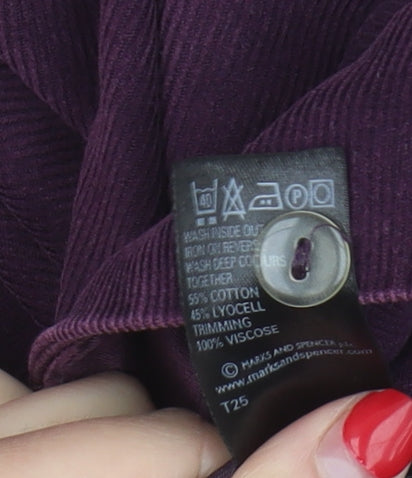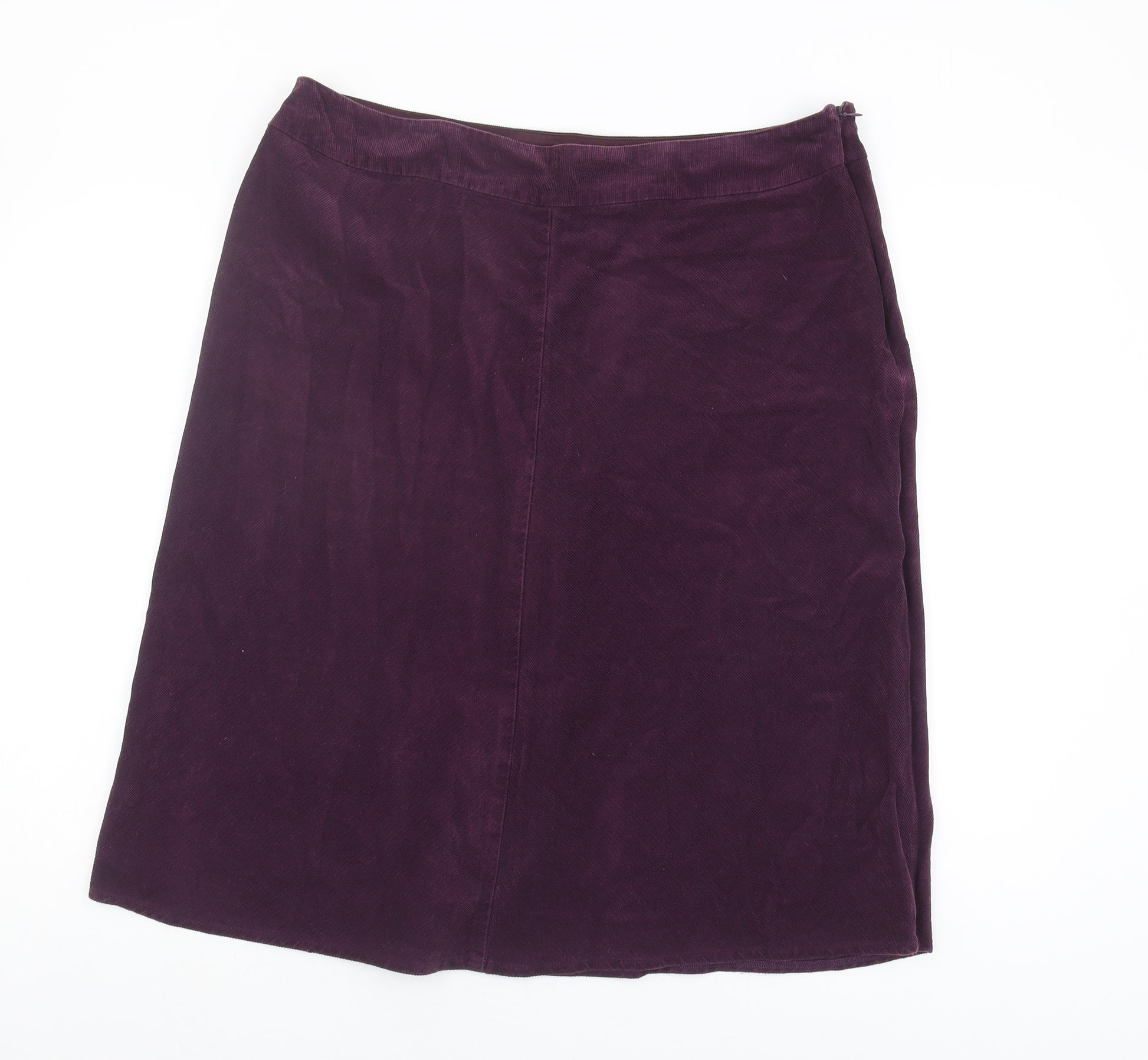 Enhance your wardrobe with this elegant Marks and Spencer purple corduroy skirt, perfect for every occasion. Crafted from a quality blend of 55% cotton, 45% cupro, and featuring viscose trimming, this skirt guarantees comfort and style. Available in size 18, this regular fit skirt is designed for women seeking a sophisticated look without compromising on comfort. The skirt falls gracefully to a midi length, making it ideal for both business meetings and casual outings. Its rich purple tone exudes a sense of luxury, while the smooth corduroy fabric provides a soft, plush texture. Though the pattern is minimalistic, the understated elegance of the design ensures versatility, making it a great addition to any outfit.This skirt comes with a handy zip closure, allowing for a snug fit around the waist. The absence of additional patterns and accents highlights its sleek profile, enabling easy pairing with various tops and blouses. Notably, the skirt is machine washable, adding to its practicality and ease of care.Despite being previously worn, this piece is in excellent condition, displaying minimal signs of wear. It offers a viable option for those seeking affordable, high-quality clothing. With its blend of classic design and modern comfort, this Marks and Spencer skirt stands out as a convenient yet stylish choice.