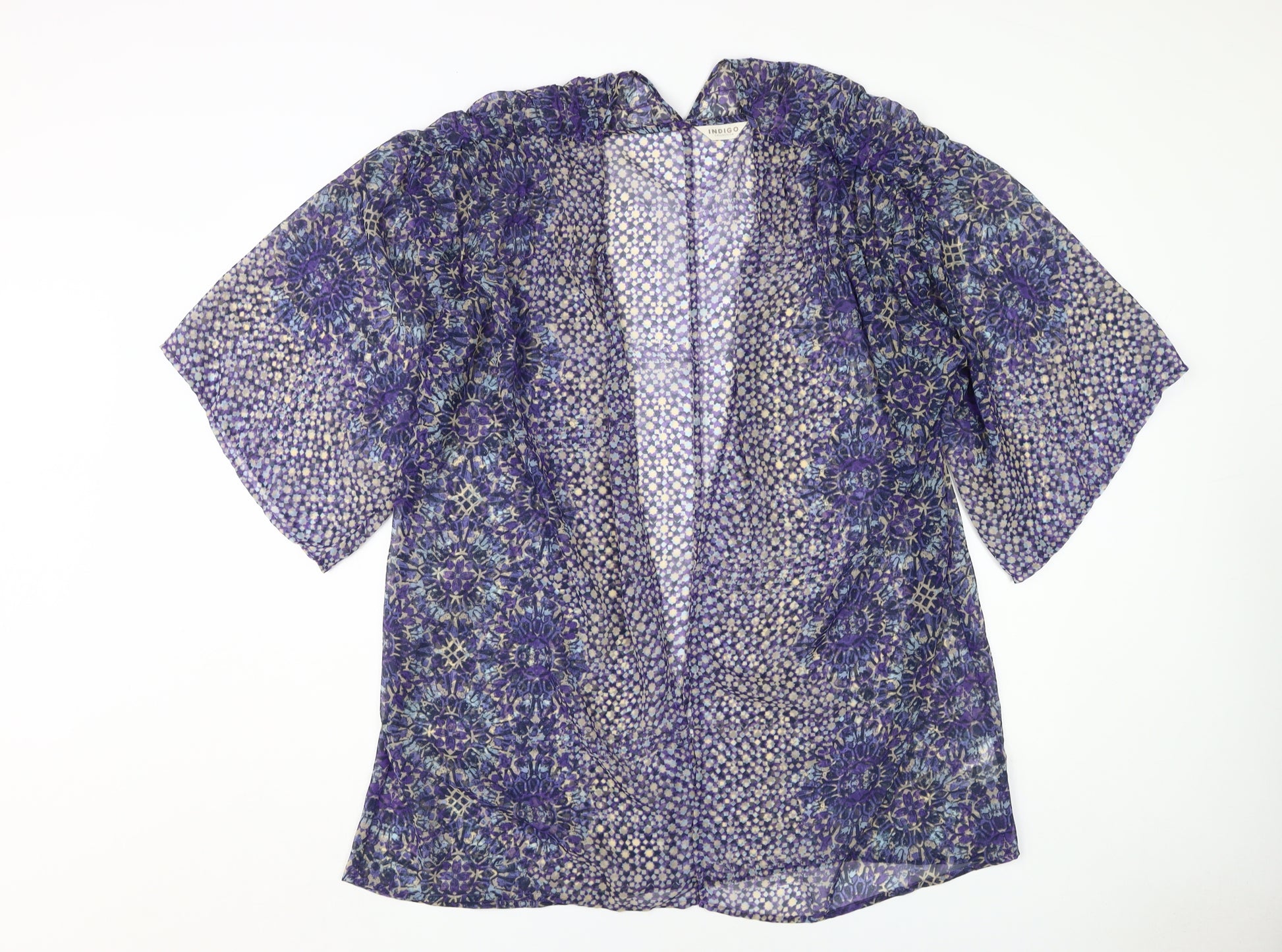 Elevate your wardrobe with this elegant Marks and Spencer Kimono style top, designed for women seeking both comfort and style. This top features a stunning multicoloured floral print, with a base hue of striking purple that exudes a hint of bohemian chic. Crafted from lightweight polyester chiffon, it promises a breathable and airy feel, making it an ideal choice for spring and summer occasions. The garment's sheer construction adds a sophisticated touch, perfect for layering over your favourite camisoles or tank tops. Its regular fit is tailored to flatter all body shapes, while the kimono sleeves bring a unique and contemporary silhouette. Ideal for casual outings or leisurely travels, this top guarantees a versatile addition to your ensemble. Whether you're planning a day out in the city or a casual brunch with friends, this piece will ensure you do so in style. With its open front, it offers easy wear and removal and pairs effortlessly with jeans, skirts, or shorts. Machine washable for easy care, it maintains its quality, ensuring longevity in your wardrobe. Condition is excellent, reflecting light overall wear and no visible defects, making this a fantastic pre-loved find. Embrace timeless elegance with this charming option by Marks and Spencer — a name synonymous with classic yet modern apparel.