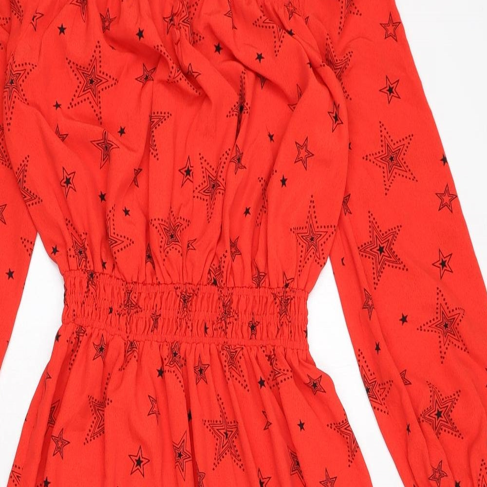 Womens Red Geometric Polyester A-Line Size 8 Round Neck Button - Star Print