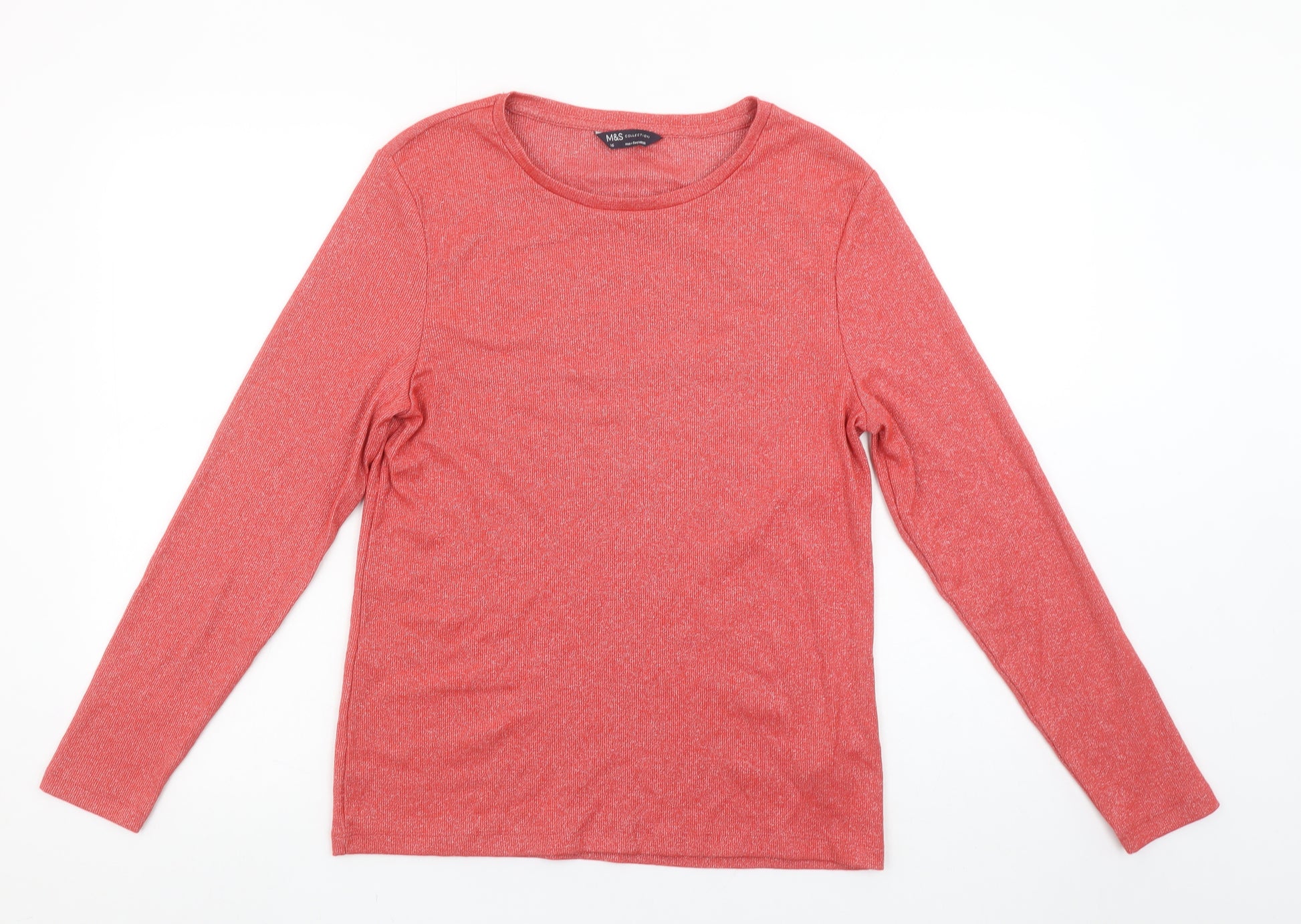 This Marks and Spencer Women's Long Sleeve T-Shirt offers both comfort and effortless style, perfect for layering or wearing on its own. Crafted from a breathable and soft cotton blend, it includes 58% cotton, 25% polyester, 13% metallised fibres, and 4% elastane, giving it a subtle shimmer with stretch for ease of movement. The fabric feels lightweight and smooth against the skin, ideal for everyday use during cooler months or transitional seasons like autumn and spring. Designed in a classic crew neck style, it delivers a flattering and timeless silhouette suitable for casual wear, work-from-home outfits, or weekend outings. The solid red hue, known as “Red Mix,” adds a warm and vibrant touch that complements a range of skin tones and pairs seamlessly with jeans, skirts, and casual trousers. The top’s long sleeves and pullover style make it simple to wear, while its metallic fibres provide a touch of understated glamour. The jersey fabric ensures flexibility and softness while maintaining durability and easy care, as it is fully machine washable. This piece embodies Marks and Spencer’s signature quality, balancing comfort, practicality, and style. Ideal for layering under blazers, cardigans, or coats, it adapts beautifully between casual and smart-casual looks. In excellent used condition with very minimal signs of wear, this T-shirt remains in great shape with no noticeable damage. A versatile addition to any wardrobe, it’s an appealing choice for those seeking a stylish yet fuss-free staple that delivers both comfort and subtle sparkle. Priced fairly for its quality and condition, this Marks and Spencer top is a wardrobe must-have for all-season versatility.