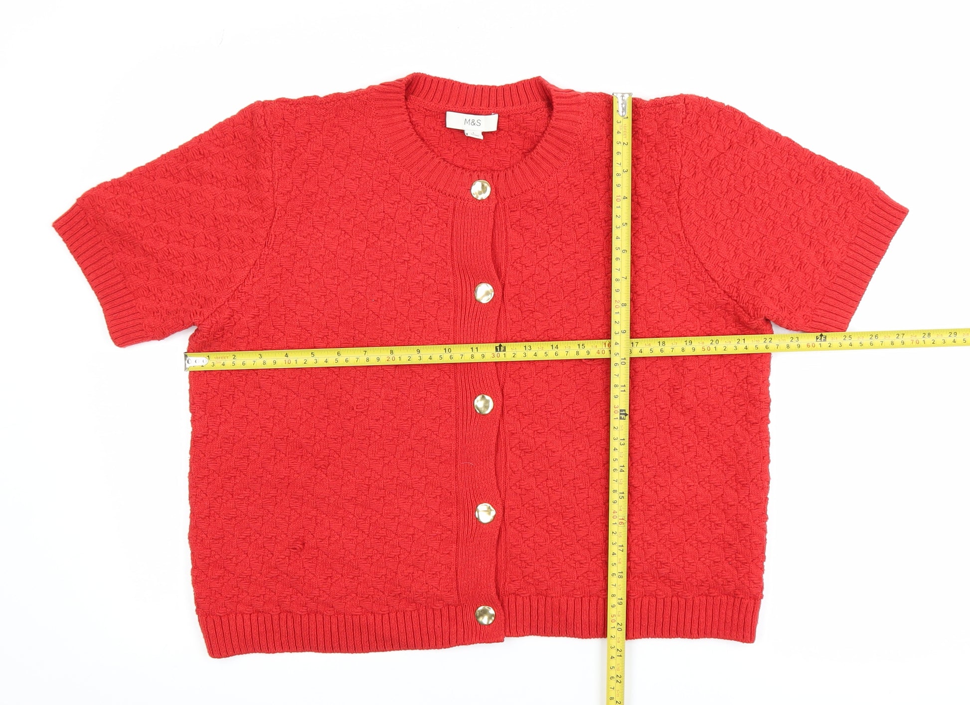 Brighten up your wardrobe with this beautiful red cardigan from Marks and Spencer, designed to add a touch of timeless style to your everyday wear. Crafted from a soft and breathable blend of cotton, polyester, polyamide and viscose, this lightweight knitted piece offers both comfort and quality synonymous with Marks and Spencer craftsmanship. The short sleeves and crew neckline keep it perfect for layering across multiple seasons, making it an ideal choice for spring, summer and autumn. The cardigan features a delicate cable-knit texture for added detail and a button-up front with gold-toned buttons that create a subtle yet elegant accent. Its classic fit provides a flattering shape suitable for a variety of body types, while the ribbed trims at the cuffs, neckline and hem ensure a comfortable fit that holds its shape wear after wear. Perfect for casual occasions, this cardigan can be paired effortlessly with jeans, trousers or skirts for a polished but relaxed look. Whether worn over a blouse for a smart-casual outfit or layered with a simple vest top for a laid-back daytime style, its versatility makes it a wardrobe must-have. Machine washable for easy care, this cardigan is both practical and stylish. Although pre-owned, it remains in excellent condition with no visible marks or signs of damage, reflecting careful previous use. Its breathable, lightweight feel ensures comfort while maintaining that chic, refined appearance that elevates any outfit. This Marks and Spencer women’s short sleeve cardigan in size large is a timeless addition to any collection, offering all-season versatility in a bold and eye-catching red tone. Combine comfort, craftsmanship, and casual elegance – a wardrobe staple that effortlessly transitions from casual daytime wear to more polished evening casual settings.