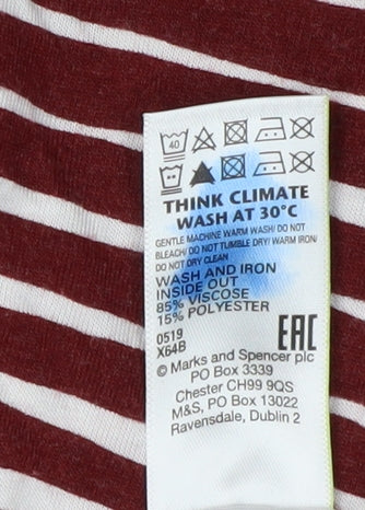 Elevate your casual wardrobe with this classic red striped T-shirt from Marks and Spencer, designed to provide style and comfort throughout the year. Crafted from a premium blend of viscose and polyester, this T-shirt offers a soft and breathable experience, perfect for everyday wear. The relaxed fit and round neckline enhance its versatility, making it an ideal choice for pairing with your favorite jeans or skirts for a chic and effortless look. The striped pattern adds a touch of timeless elegance, while the long sleeves ensure warmth during cooler months. Suitable for a wide range of occasions, from casual outings to leisurely weekends, this T-shirt infuses the classic striped style with a modern twist, keeping you effortlessly fashionable. Easy to care for, this machine washable top retains its quality wash after wash, maintaining its vibrant colors and comfortable fit. Whether heading to a brunch with friends or engaging in a relaxing day at home, this T-shirt serves as a staple piece in your fashion array, balancing simplicity with aesthetic appeal. Don't miss out on the opportunity to add this must-have item from Marks and Spencer to your collection, ensuring you're both stylish and comfortable every day.