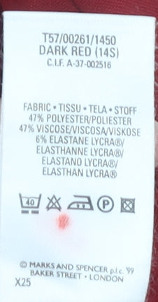 These elegant Marks and Spencer trousers in a striking red hue add a bold and sophisticated touch to your wardrobe. Designed for women, these trousers offer a straight leg style that provides a flattering silhouette suitable for various occasions, from business meetings to casual outings. Made in Morocco, they are crafted with a blend of 47% polyester, 47% viscose, and 6% elastane, offering both comfort and durability. These trousers feature a UK size 14 with a waist measurement of 76 cm, ensuring a comfortable fit. Despite being pre-owned, they are in excellent condition with only minor signs of wear and no original sales tags. These trousers are machine washable, making them practical for everyday use. A versatile choice for enhancing your ensemble, they seamlessly blend style and functionality.