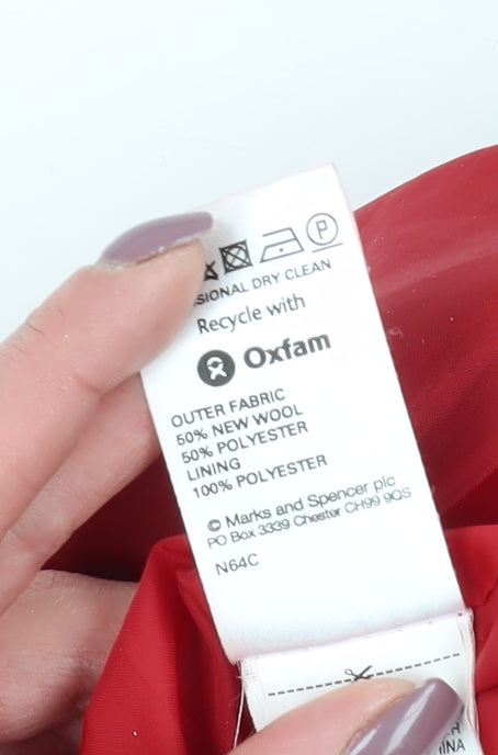 Experience the timeless elegance of the Marks and Spencer Women's Red Wool Overcoat, a perfect blend of sophistication and warmth. Crafted meticulously from a luxurious mix of wool and polyester, this mid-length coat is designed to uplift your autumn and winter wardrobe. Showcasing a radiant red tone, the overcoat is styled in classic herringbone tweed, illustrating both traditional charm and contemporary flair. This coat features a structured collared neckline and a streamlined silhouette, ensuring a flattering fit suitable for all body types. The long sleeves add to its cosy appeal, making it an ideal outer layer for chilly days. Fastened with elegant button accents, this coat not only promises style but also superior comfort and convenience. Lined with polyester, it offers added warmth and comfort, making it perfect for casual outings or business settings. The integrated pockets add functionality, ensuring you stay chic wherever you go. This coat is in very good condition, with minor wear visible, offering remarkable style and durability. Add a touch of classic sophistication to your ensemble with this versatile coat that's well-suited to both casual and formal occasions. An essential for any fashion-conscious woman, this overcoat promises to be a standout piece in your wardrobe.