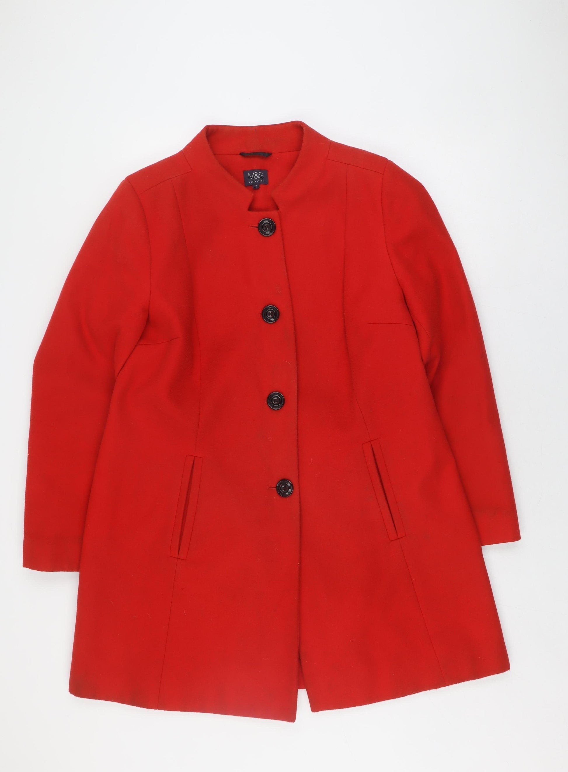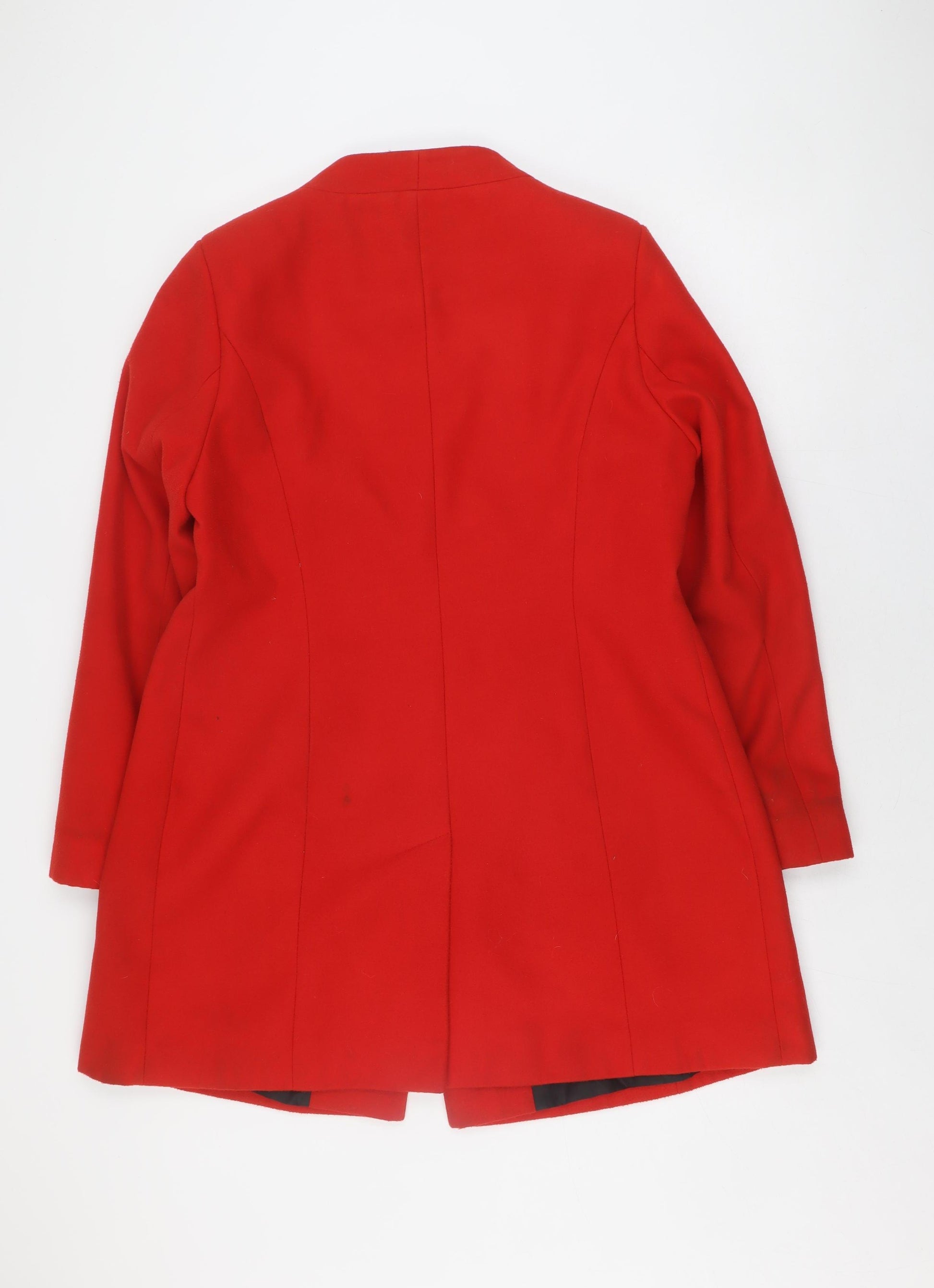 Step out in style with this striking red overcoat from Marks and Spencer, designed to elevate your wardrobe effortlessly. Crafted from a luxurious wool blend, this coat exudes warmth and sophistication, making it a perfect companion for the colder months. The coat features a mid-length cut that offers both functionality and elegance, suitable for both business and casual occasions.The vibrant red hue ensures you stand out, adding a pop of colour to any ensemble. Its single-breasted design with classic button accents adds to the sophisticated aesthetic, while the fully lined interior enhances comfort, ensuring you stay warm without compromising on style.This coat is ideal for the autumn and winter seasons, providing an excellent layer against the chill. The long sleeves offer extra warmth, making it an essential piece in a versatile wardrobe. Its tailored fit flatters your silhouette, while the regular size 16 ensures a comfortable fit.With minimal signs of wear, this coat remains in excellent condition, ready to give its next owner a sense of fashion-forward flair. Dry clean only, it retains its luxurious feel with the right care.Whether you're heading to the office or out for a casual day, this Marks and Spencer overcoat is a staple for any stylish woman. Its timeless design and vivid colour make it a must-have addition to your coat collection. Don't miss out on this opportunity to own a piece that marries practicality with a bold statement.
