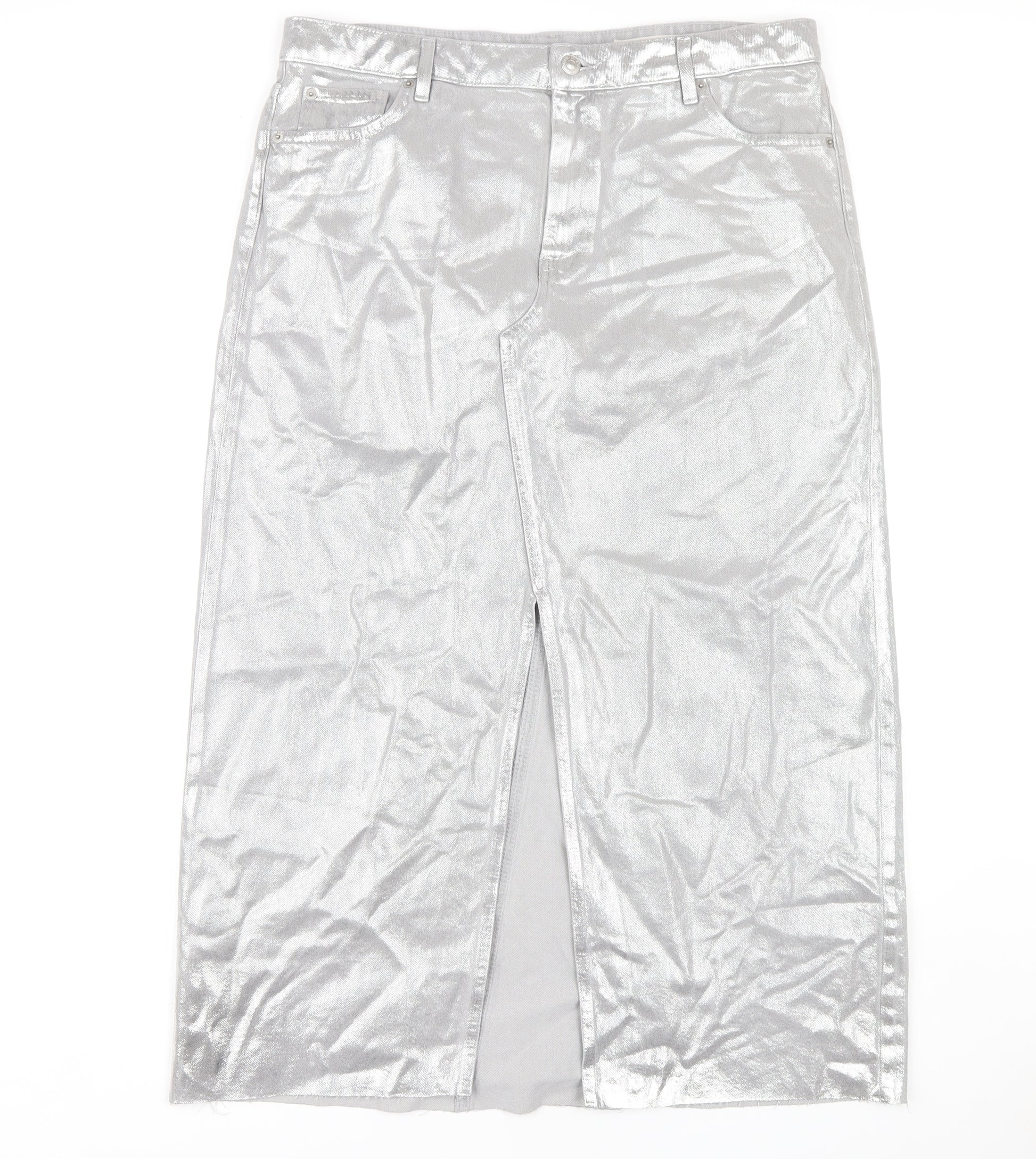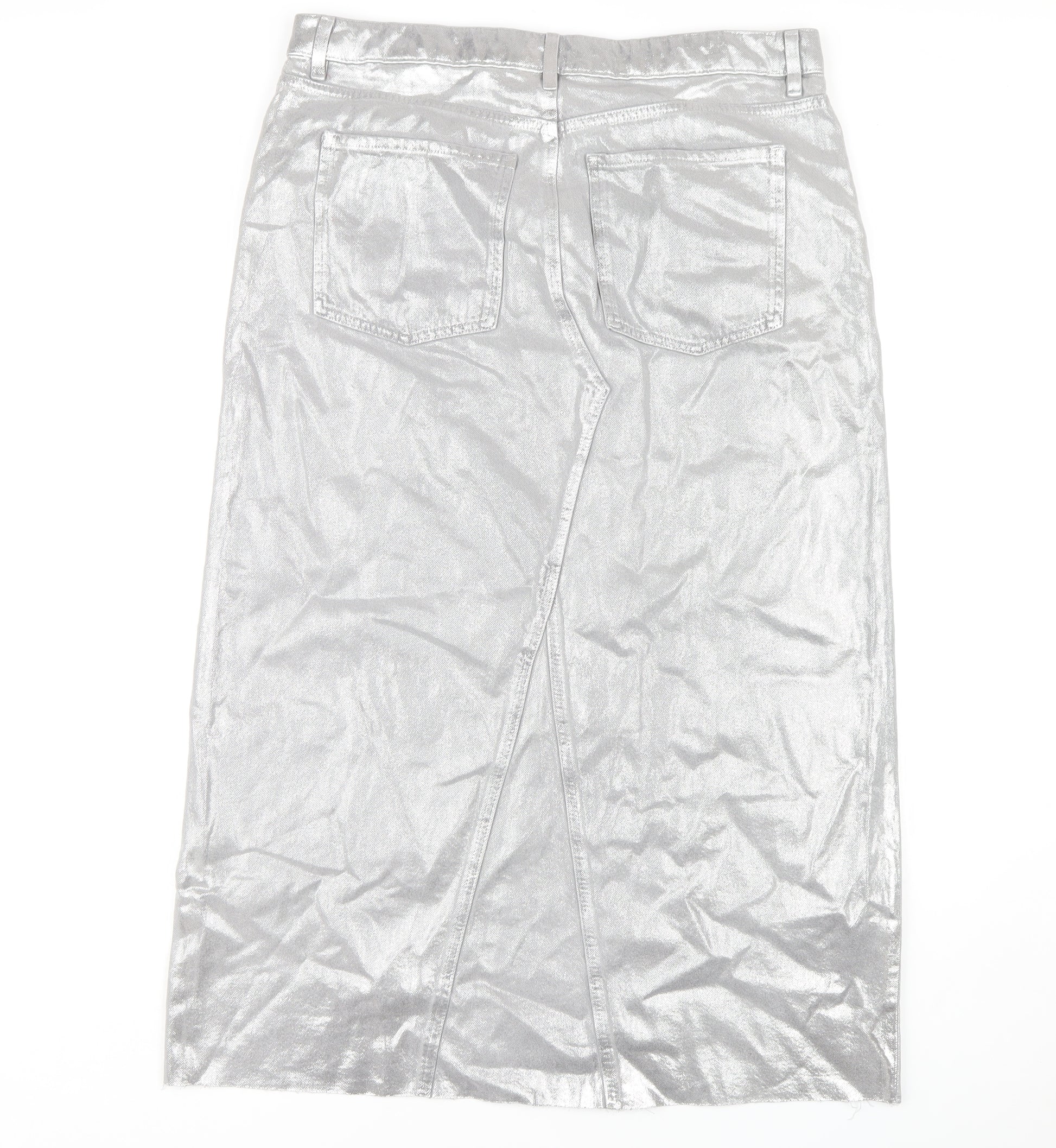 Elevate your wardrobe with this stunning Marks and Spencer silver maxi skirt, a perfect blend of comfort and style. Crafted primarily from durable denim fabric, this skirt offers a luxurious touch with 98% cotton ensuring softness, and 2% elastane for a perfect fit. Designed in a straight & pencil style, it elegantly enhances your silhouette. The shiny silver hue adds a chic edge, making it ideal for casual outings and events. Versatile in function, it boasts convenient pockets for added practicality. Suitable for all seasons, it comes with a zip and button closure, ensuring a secure fit. Its regular size 18 and mid-rise design promise both comfort and modern elegance. Perfect for casual outdoor gatherings or intimate meetings, this skirt transitions smoothly across occasions. Enjoy the contemporary aesthetic of this piece, easily paired with your favourite tops for a fashionable statement. Although gently used, it's in excellent condition with minimal signs of wear. Add this pop of metallic glamour to your collection today.