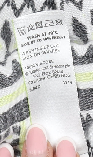 Discover effortless style with this Marks and Spencer dress featuring a striking geometric pattern in black and lime green tones. Crafted from 100% viscose, this lightweight dress promises comfort and breathability. The sleeveless design and strappy sleeves make it ideal for warm weather outings. Its machine washable quality ensures easy care, while the tie at the waist adds a flattering touch to your silhouette. Perfect for casual occasions or dressed up with accessories, this dress is versatile for both day and night events. The condition is impeccable with tags intact, ready to bring fresh elegance to your wardrobe.