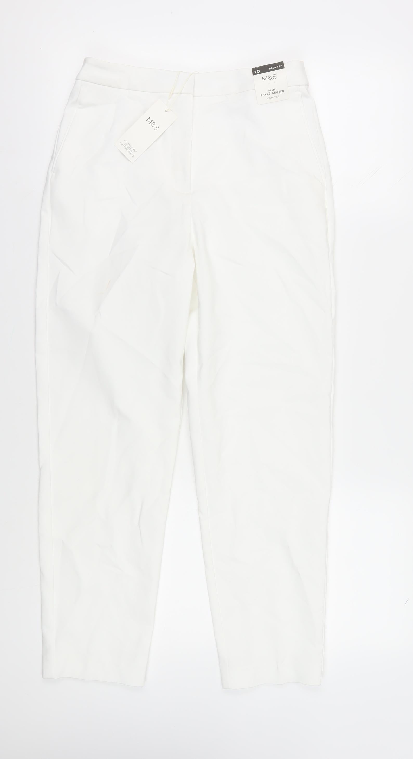 Embrace effortless style with these Marks and Spencer women's ankle trousers in a pristine white hue. Expertly crafted from a blend of 50% cotton, 47% polyamide, and 3% elastane, they offer a comfortable and flexible fit. Ideal for the modern woman, these trousers feature a regular fit and mid-rise, ensuring they flatter any silhouette. The straight leg style and flat front add a touch of sophistication, perfect for both casual outings and more formal occasions. Their machine washable nature makes them easy to care for, combining practicality with elegance. Versatile and chic, they are a must-have addition to any wardrobe.
