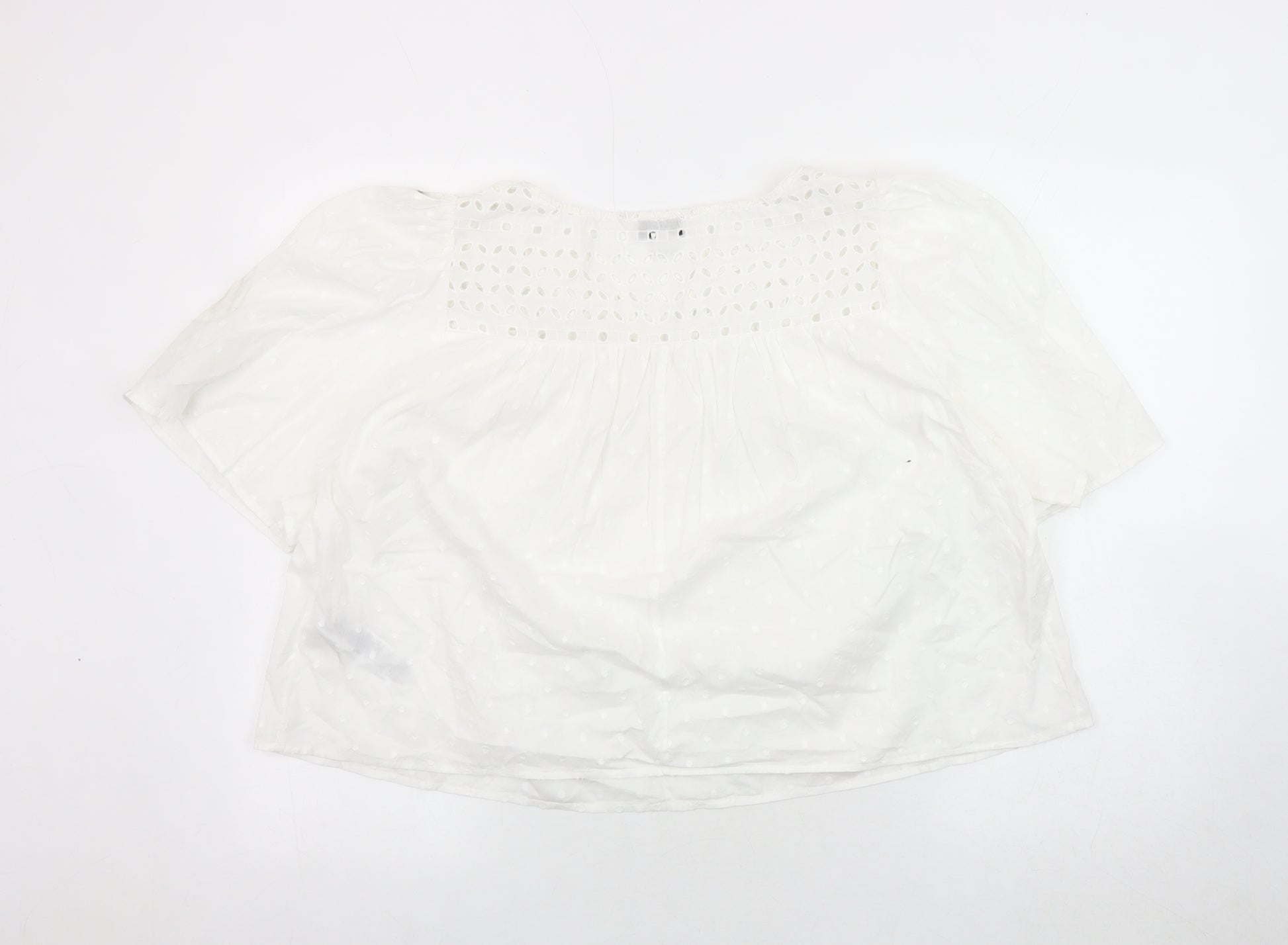Elevate your wardrobe with this elegant Marks and Spencer Women's Blouse in a timeless white hue. Crafted from lightweight, breathable cotton, this blouse ensures comfort and style during warmer months. Its simple yet sophisticated design is enhanced by delicate embroidery accents, adding a touch of femininity to your ensemble. The short puff sleeves offer a modern twist on a classic silhouette, making it a versatile piece suitable for both casual outings and relaxed settings. Designed with a convenient pullover style, the blouse fits seamlessly into your daytime wardrobe. Easy to care for, it is machine washable, which allows for effortless upkeep, maintaining its crisp, fresh appearance. Whether paired with jeans for a laid-back look or dressed up with a smart skirt, this blouse is a must-have staple. Perfect for spring and summer occasions, it combines functionality with flair, making it an ideal addition to your collection. Slight wrinkles are present, reflecting gentle wear, but it remains in excellent condition, ready to complement your style with its timeless charm.